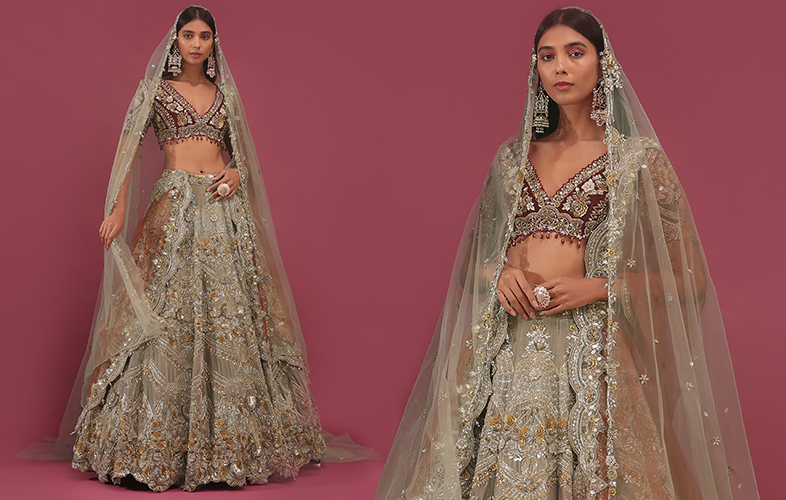Well, if you are someone who wishes to tread the traditional route but finds it fun to mix ethnic with a contemporary touch can go for this unique-hued brown colored lehenga from KALKI’s Noor collection. The velvet lehenga would reflect your unique style and your willingness to experiment and be fearless in your Indian persona and aura. Go for this exquisite couture and you will positively spark a trend for this new hue.