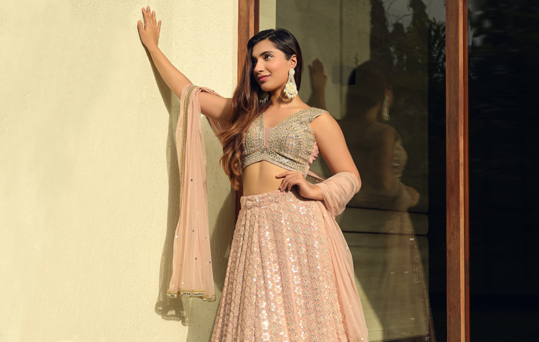 Give your traditional chikankari lehenga a modern touch and ethnic vibes by choosing one that features V-neck chikankari crop top in sequins. The chikankari choli paired with a studded and beautiful mirror work skirt will leave the onlookers completely awestruck. Add a dupatta with mirror, lace, zari work in Lucknowi style that is no less than a piece of artwork for your diva look at your sangeet and cocktail bash.