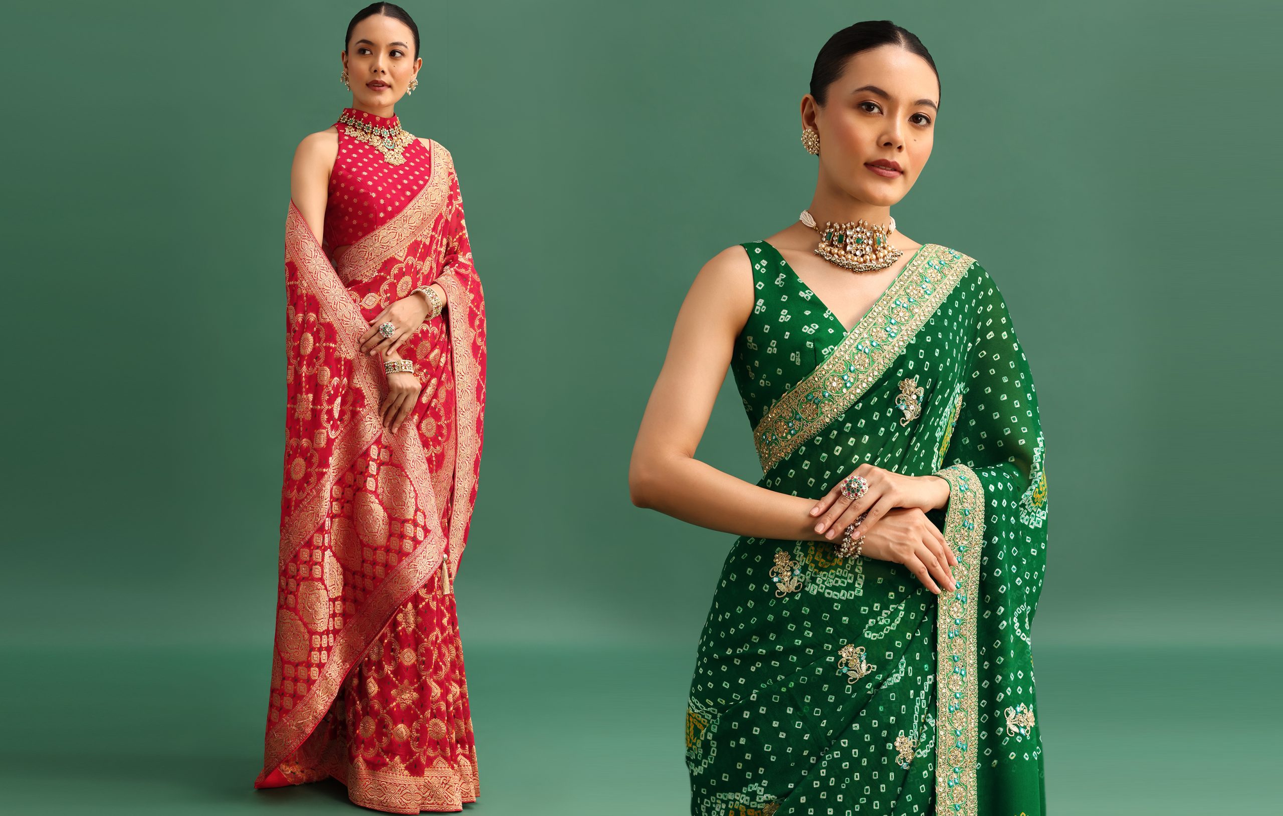 Hand-dyed bandhani sarees are popularly worn on Teej as they hold great cultural significance and can be embraced by women of all age groups. They are available in a variety of colours and designs and look very exquisite. Mostly available in lightweight fabrics they keep you comfortable during the warm and humid season. Pair them with matching or contrasting blouses with unique necklines and make a striking statement.