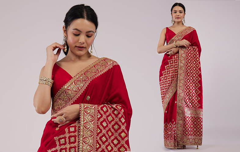 Indulgence in this scarlet red saree is all about festive vibes and elegance. If you are looking forward to getting dolled up in Indian craftsmanship and culture; nothing can beat the look and grace of the saree for that matter. The stunning and intricate pallu and beautiful woven golden floral design can finish off your captivating Teej look. The glittery touch of the saree is just apt for the Teej dress up.