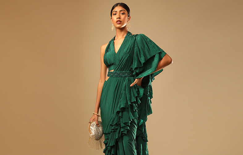 The lover of ruffles; here is a splendid number for you. The ruffle details offer a dream-like flair to any trendy or Indian wedding saree; hence taking your style quotient a notch higher. Be it your own sangeet or reception or your BFF’s wedding; a ready-to-wear saree with pleats or ruffled border will get you an instant ‘straight out of fairytale’ look.
