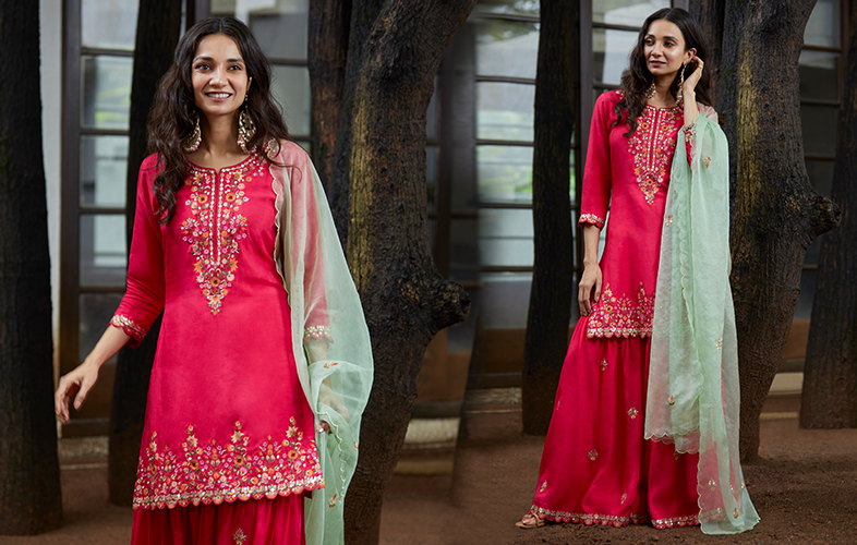 The front slit kurti in various designs is having a major moment these days. The jacket style front-slit kurtis or front open kurtis in anarkali patterns can make for perfect choices for a pre-wedding function. Bandhgala or collar-neck kurtis in a front-open pattern can help break the monotony. Splash of colours or yummy colour combinations will set your outfit apart from the crowd.