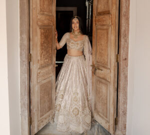Radhika’s lehenga for the sangeet ceremony was a breathtaking creation by Abu Jani and Sandeep Khosla, that featured a vibrant pink and gold colour scheme. The intricately designed pre wedding dress boasted exquisite embroidery and zari work with delicate floral patterns that added a touch of whimsy. Radhika embraced the ‘Regal Glam’ theme with the pastel lehenga shimmered with Swarovski crystals. The overall look was a stunning blend of traditional craftsmanship and contemporary style.