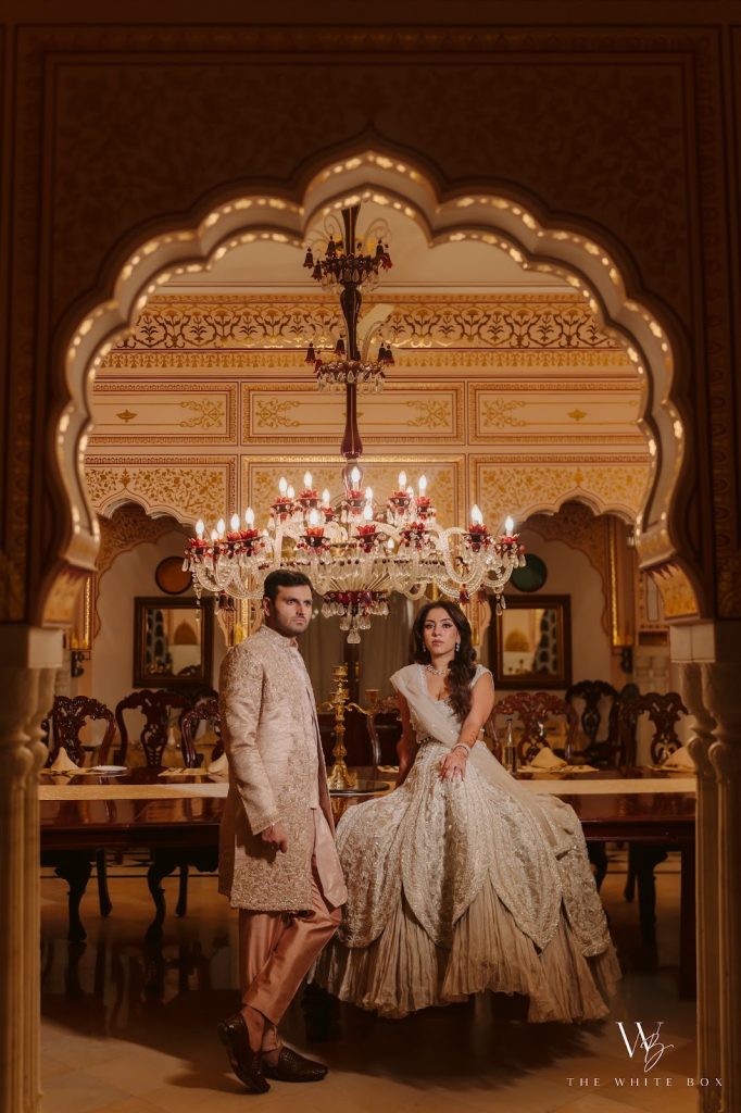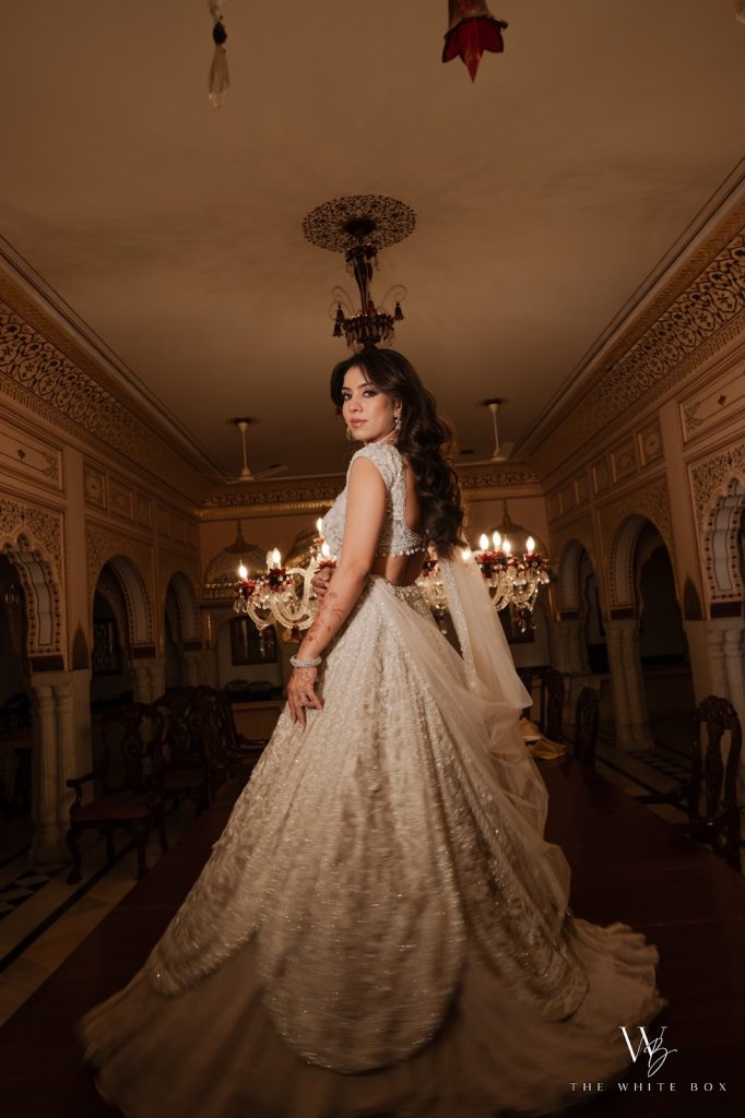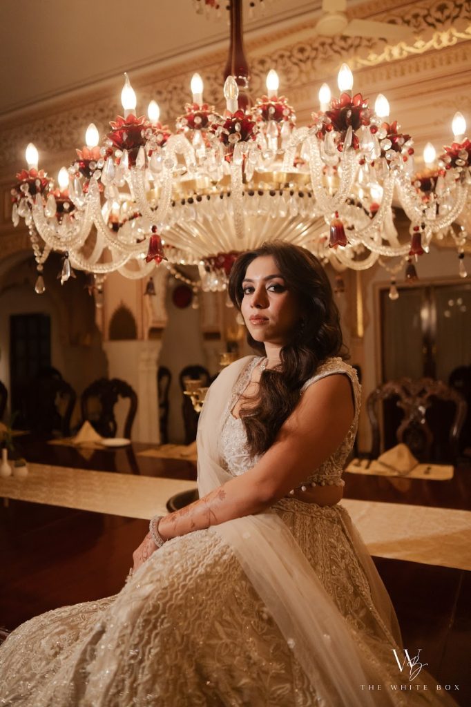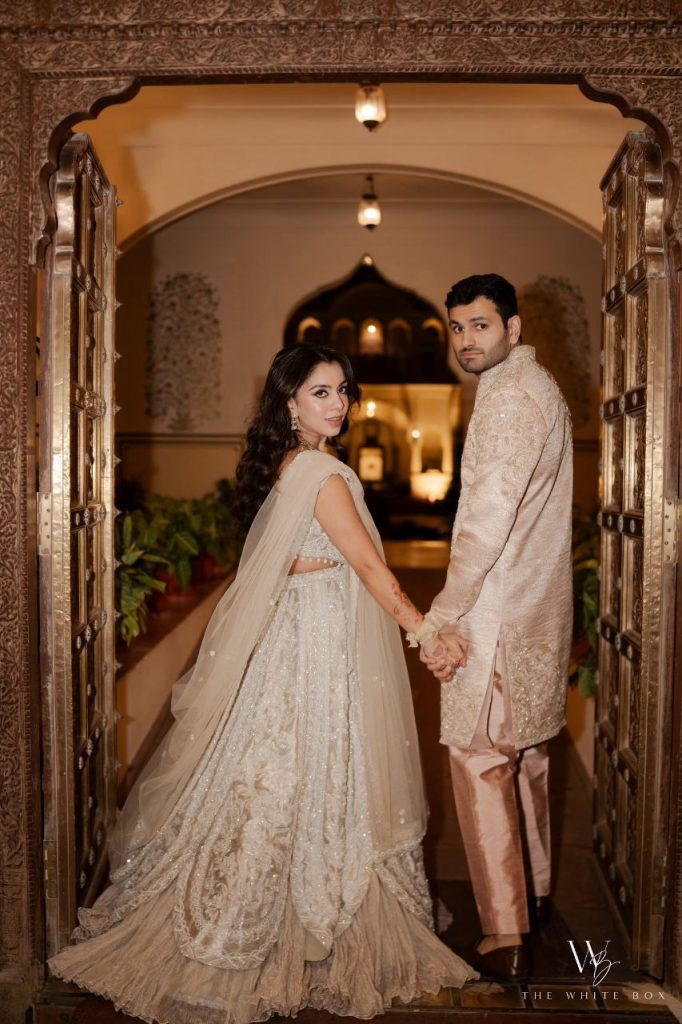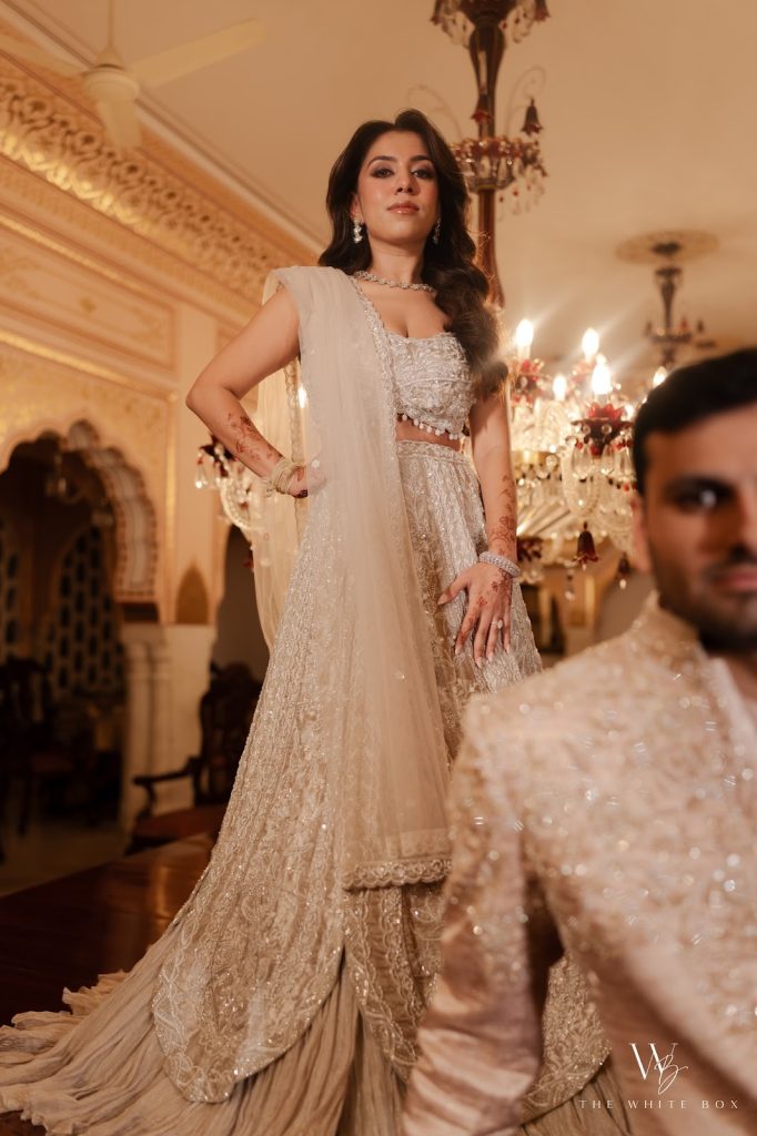 The lehenga struck a perfect balance between old and new. Crafted with banarasi brocade, it paid homage to traditional Indian textiles, while the modern silhouette, fluid flare, and clean design gave it a contemporary edge. Against the heritage backdrop of Ranthambhore, the ivory tone stood out softly—luminous without being overpowering, regal without feeling heavy.