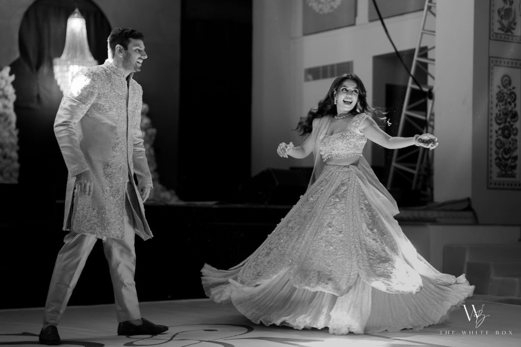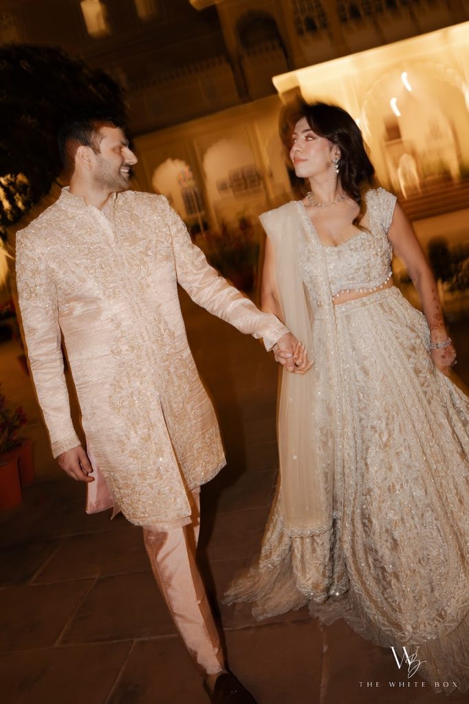 For Neal, the vision was equally thoughtful. Moving away from the darker, more conventional shades often seen in groom’s sangeet outfits, the couple wanted something lighter, fresher, and cohesive with Shriya’s ensemble. They found the perfect outfit at Kalki, one that complemented her ivory lehenga beautifully without competing with it.