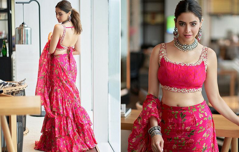 Floral saree never goes out of fashion. In fact they are the best pick for the sweaty and humid monsoon season. Flower would add some freshness and quirkiness to the saree attire and the ruffles and layers would weave magic and drama. Aamna’s latest photoshoot has delighted her fans and explains the same. Her beautiful pink saree drape with a backless choli is looking like a stunning choice for edgy fashionistas and the bridesmaids too.