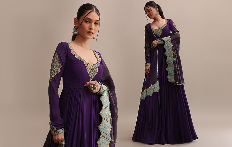 Embroidered anarkali suits are the epitome of regality and grace and are a reflection of India’s rich traditions and craftsmanship. You can choose from a variety of anarkali suit party wear with unique embroidery styles such as mirror, phulkari, kantha, lucknowi etc that enhance the beauty of the attires. The exquisite embroidered purple anarkali suit from KALKI is a classy outfit that will make you look ravishing and fetch you many compliments.
