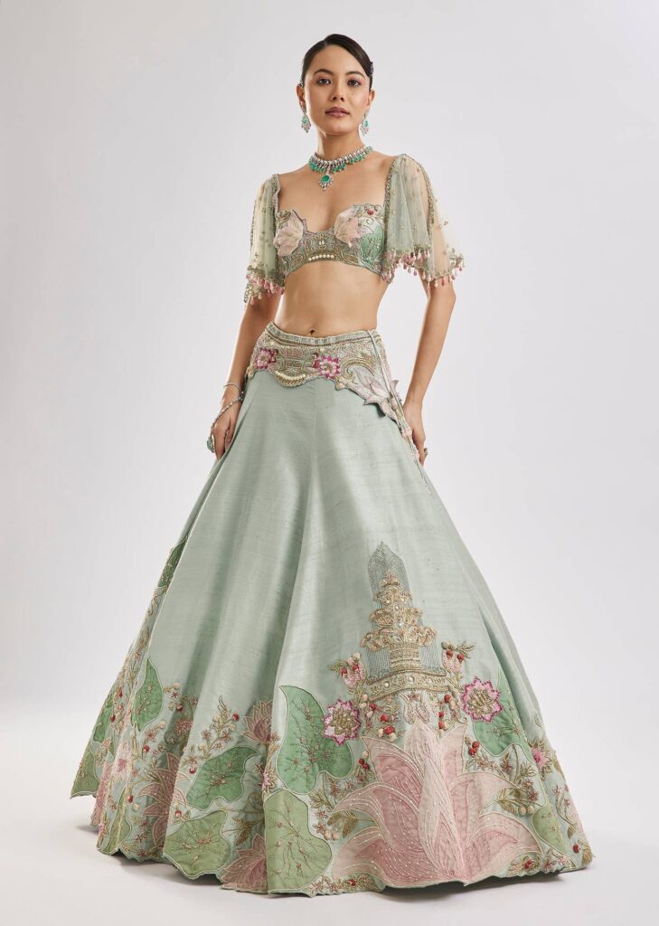 Wish to stand out? The Spring-Summer ’26 line promises just that. No matter what your taste it, whether you like a heavily embroidered ready-to-wear lehenga or something lighter for pre-wedding events, you will find some of the best lehenga designs here. Once you are convinced with the designs, next comes their quality. The fabrics, detailing, and even finishing, everything here is premium. And yet the pricing here is balanced, making it the perfect place for you to shop. Another reason why women swear by this store is that they offer customization. Whether you wish to get your blouse altered or tweak the embroidery, you can expect such services here. It’s like you are walking into a store not just to buy an outfit, but to get an experience for a lifetime.