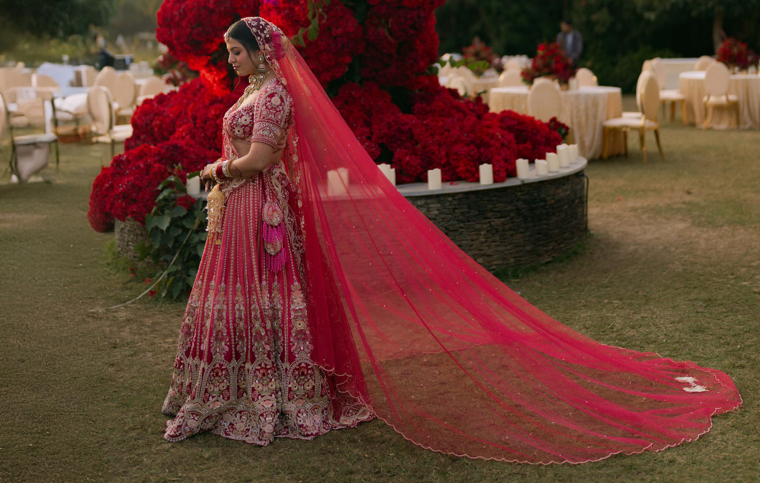 A pastel pink bridal lehenga paired with delicate diamond or pearl jewellery would give you a fantastic look. Embellished heels, soft makeup, and a stylish clutch will elevate your look to another level.