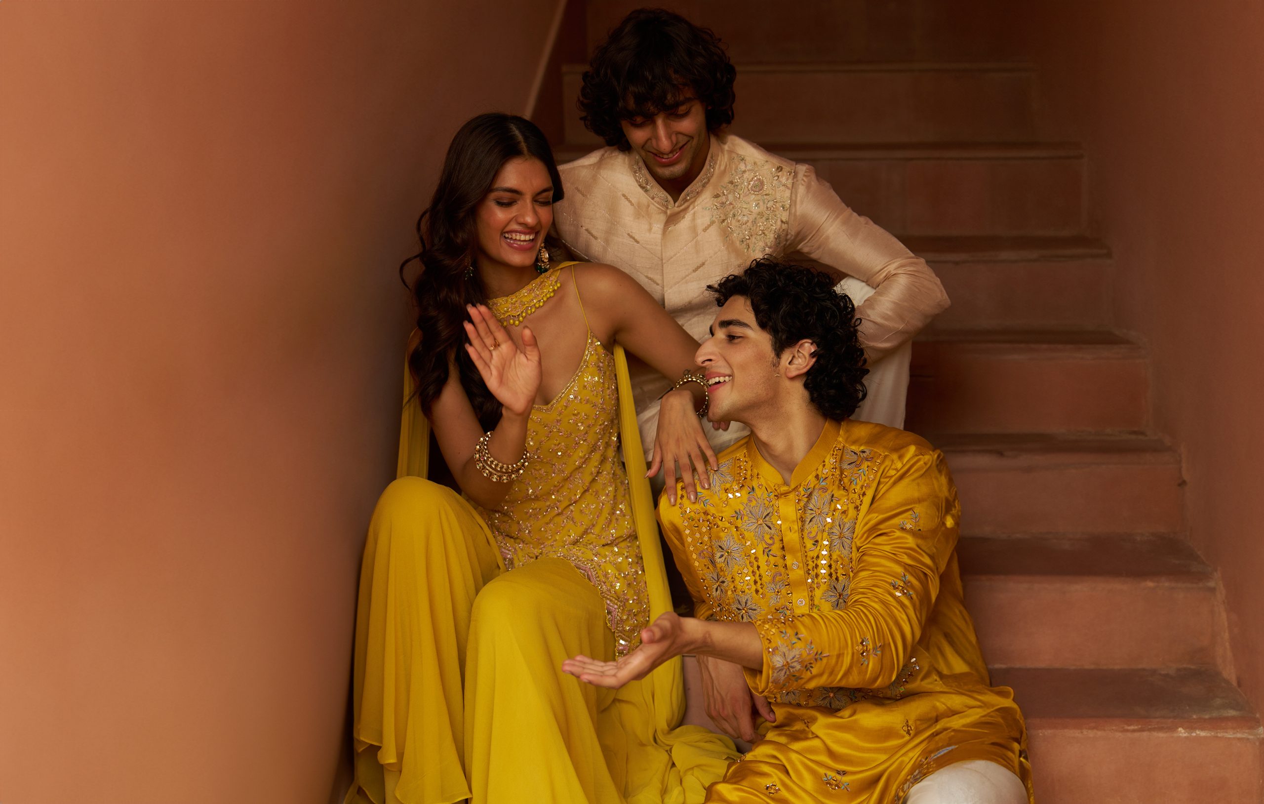 These styles are dedicated to the siblings who are coming together after years to celebrate the festivity of Bhai Dooj. Your sibling will be sporting a yellow pashmina ensemble. He will look effortlessly stylish and poised reminding you of his childhood self. Meanwhile, if you are not a fan of traditional saree for women then you must sizzle in this stunning yellow embellished crop top amplifying your modern silhouette. You both will be like a dream team of fashion. You will be turning heads and stealing the limelight when you go along with cherishing this bond by lighting up fireworks.