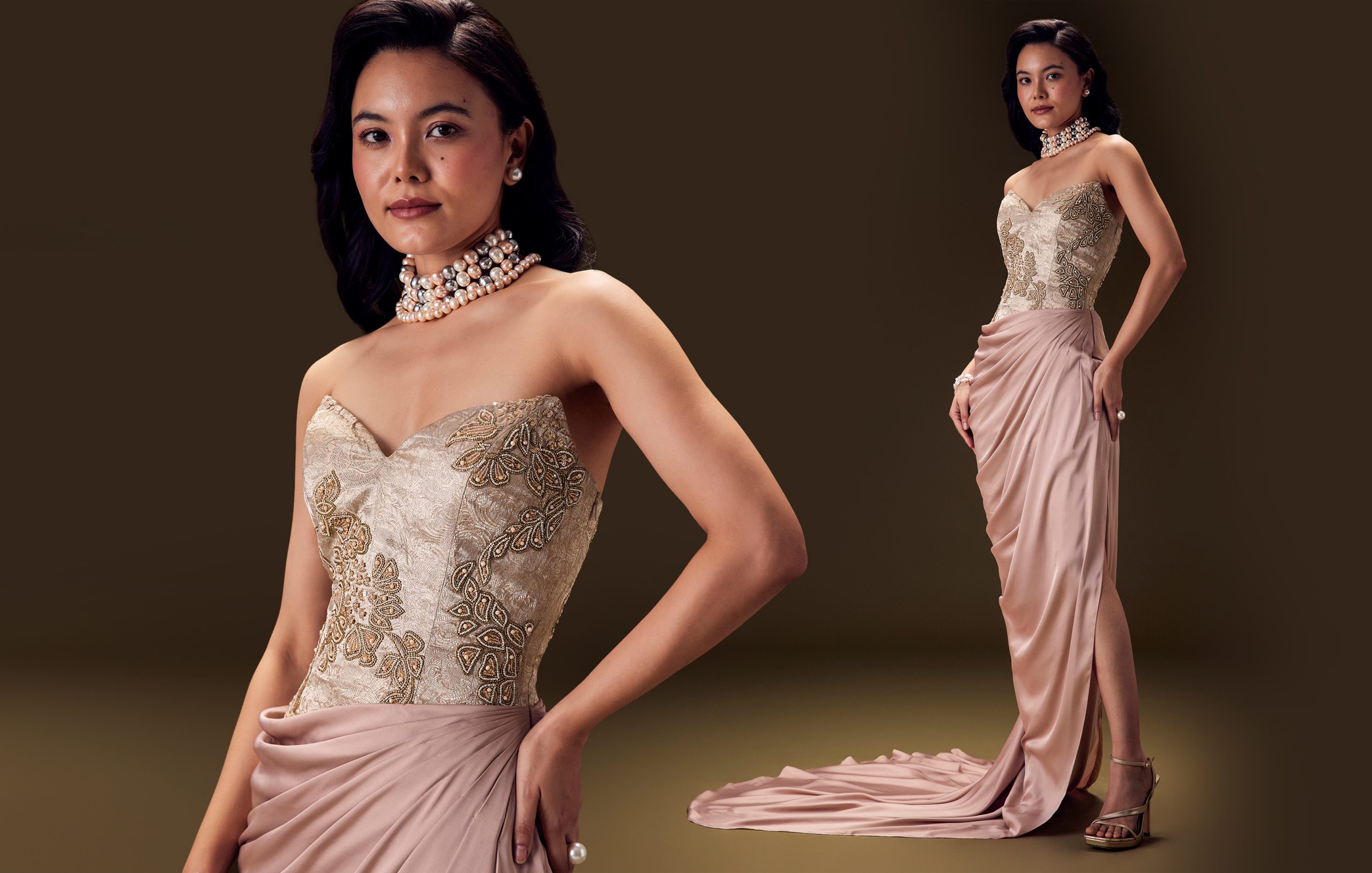 Befitting the celebratory occasion perfectly, this is a gown that complements the popping of that champagne bottle! The gorgeous champagne beige net gown has a pleated shimmer satin under layer. An over lapping bodice in embroidered net, this is one glamorous piece with heavy 3D flower,cut dana, and sequins work.Feel like royalty with an attached net drape at the front and back.