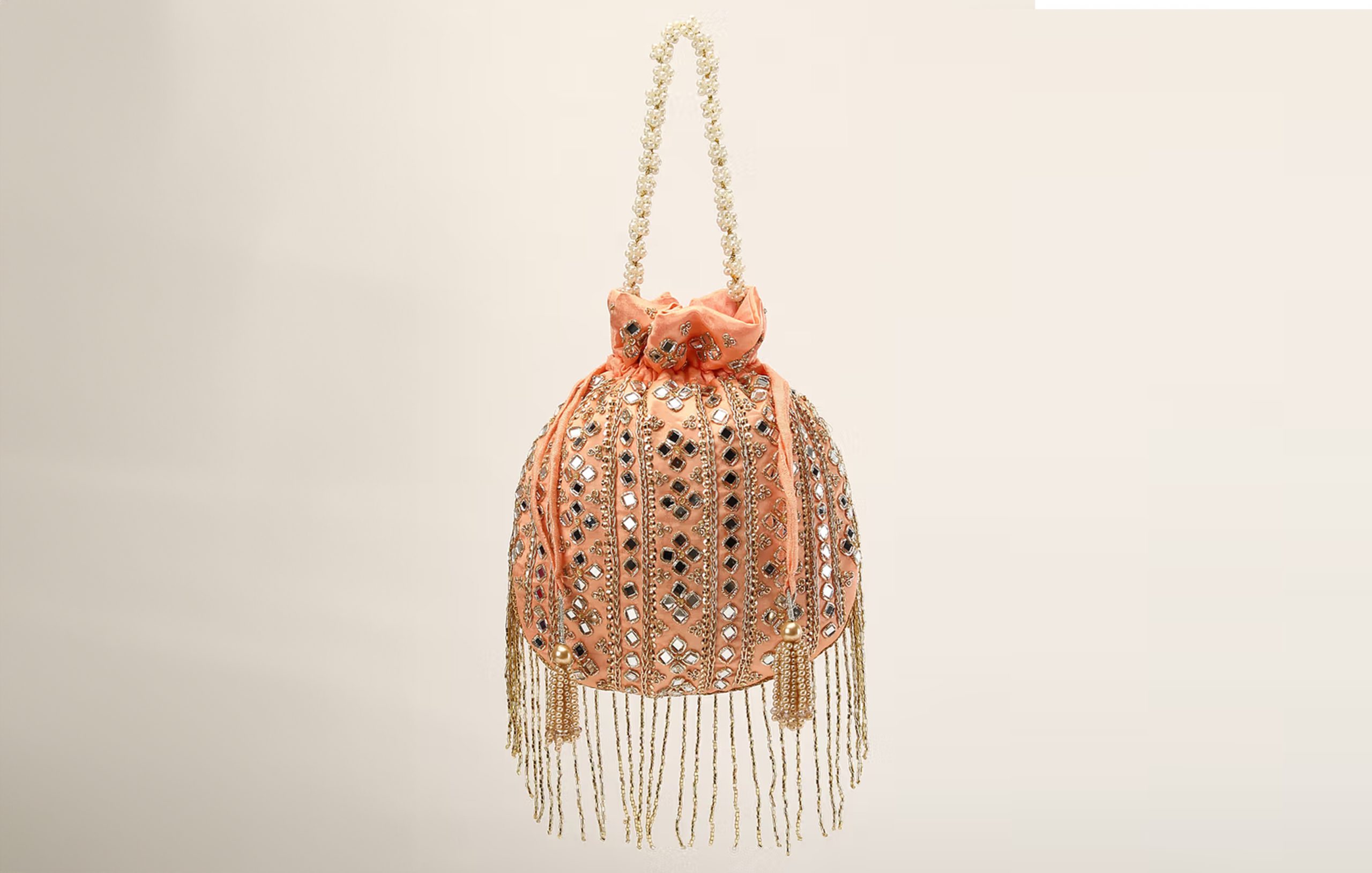 The satin potli bag is a masterpiece with hand-embroidered geometric designs using zardosi, sequins and mirror work. Trimmed with cutdana fringes. It comes with a pearl handle and tassel dori closure.
