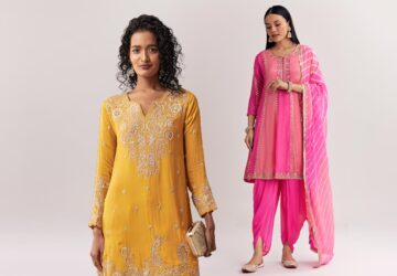 She wore a KALKI raw silk pink lehenga choli. It was embellished in zari embroidery all over along with pearl matched with net dupatta. She styled the entire outfit with gold and pearl earrings and mang tikka. She kept her hair naturally curled which is her go to hair-style.