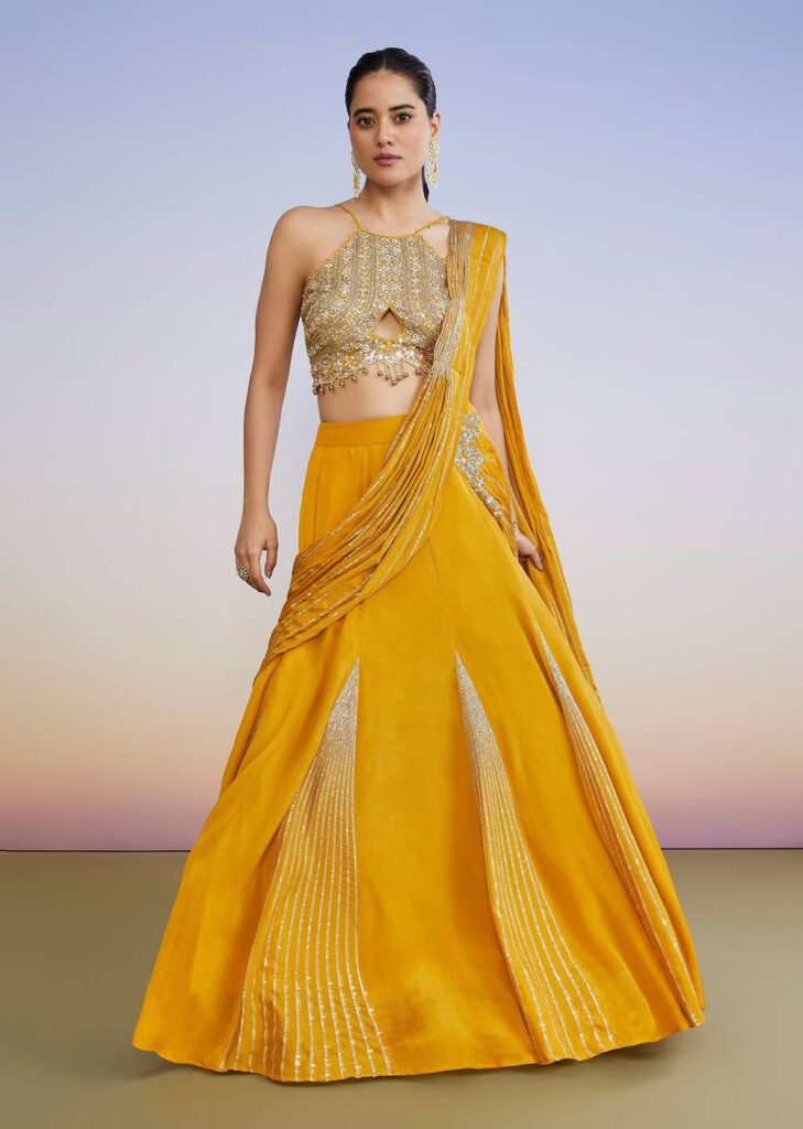 Yellow Drape Style Lehenga With Sequin Cut Dana