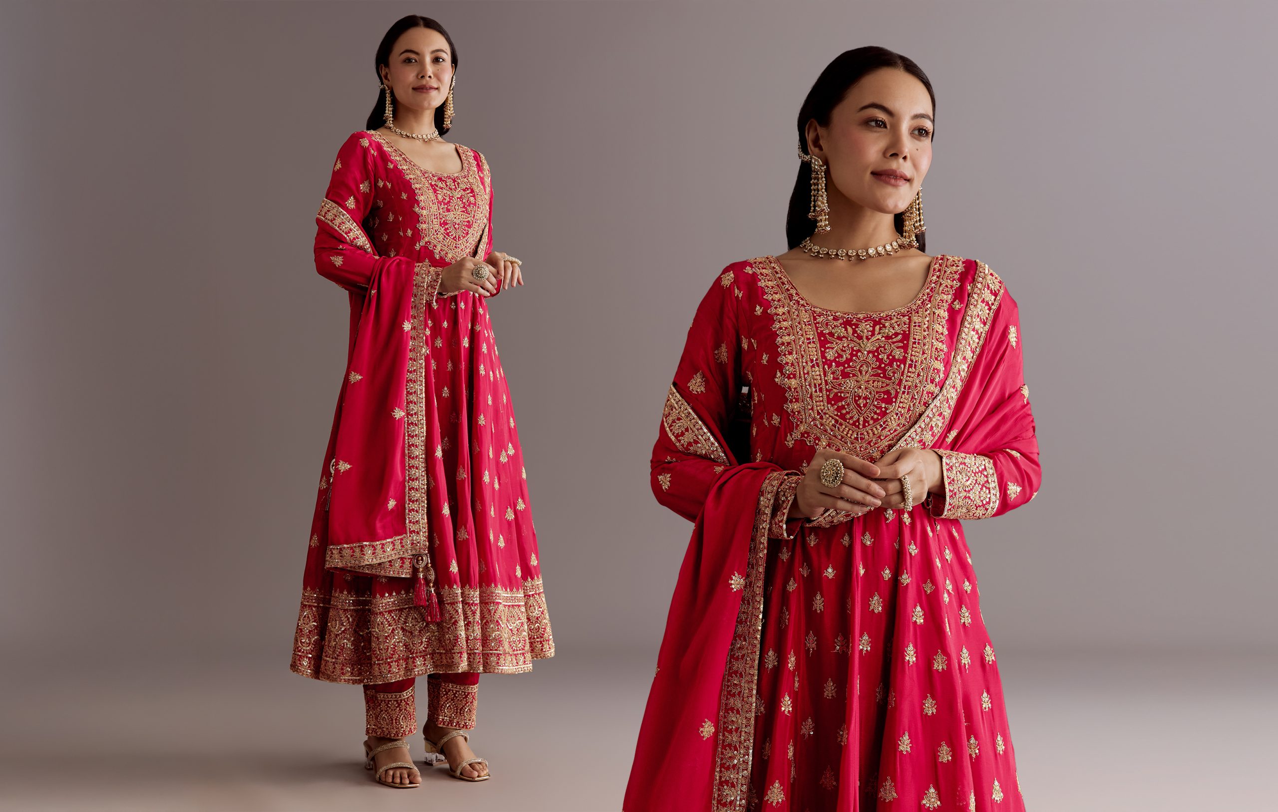 Red has a sacred position in ethnic wear, particularly in Indian culture. Red is used to signify love, fecundity, and potency, making it the most widespread choice for wedding wear. Red sari or lehenga is also traditionally used on the occasion of weddings to bring blessings for prosperity and marital happiness. Outside of nuptial occasions, red also appears in ceremonial wear at festivals, pujas, and other sacred events, pointing toward its position as a symbol of colour of extreme emotional and religious value.