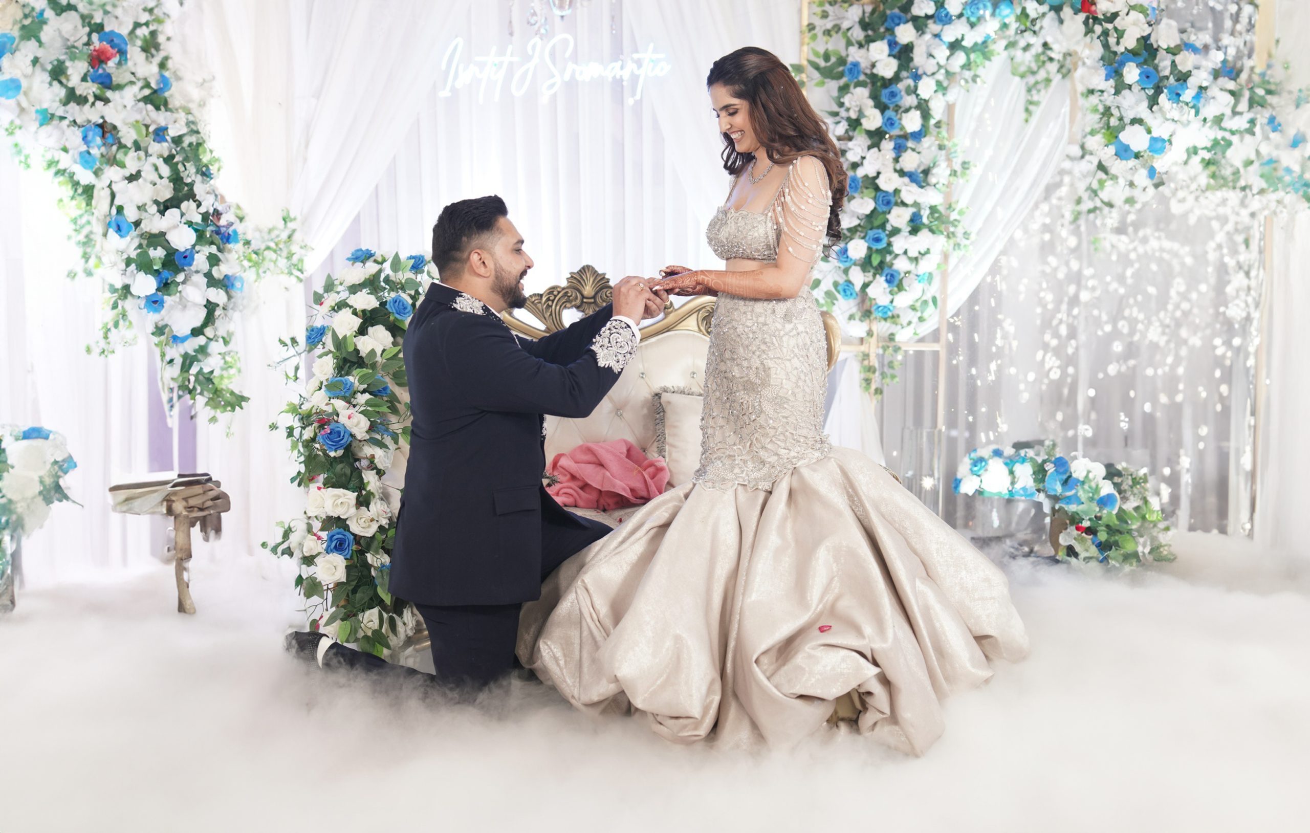 Everything about our engagement day was symbolic of love and grandeur. From the décor of blue and white roses at the engagement venue to the bursting of firecrackers on our entry, everything looked dreamy and magical. I was deeply touched when Jatin went down on his knees to put the engagement ring on my finger. Looking into his eyes and holding him tight as we walked into the venue gave me an ecstatic feeling. I can’t thank God enough for showering his abundant blessings on us.