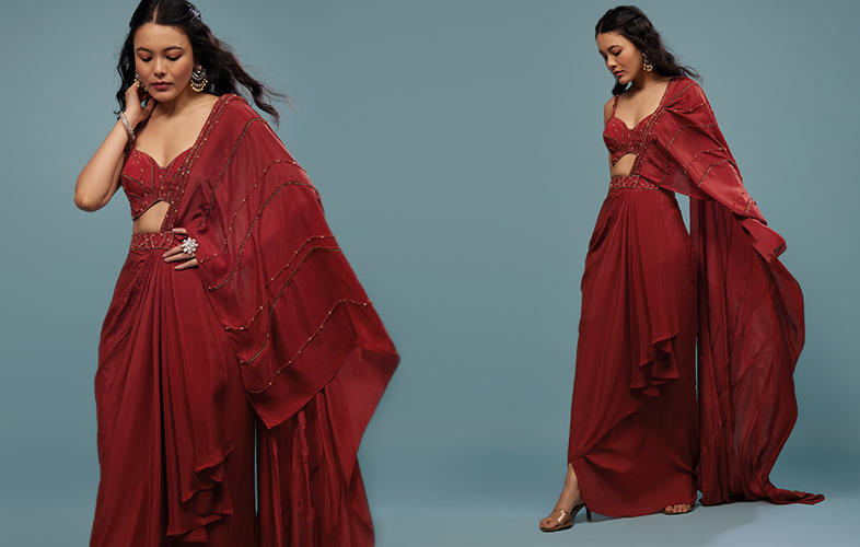 The freedom of creativity gives KALKI more room to come up with the best in the form of this ravishing red cocktail outfit. Putting together a well-styles and tailored outfit for a party and still maintaining that comfort can be tricky. However, KALKI has figured out the best in the form of this contemporary ensemble that has stylish high low pleats at the waist to the embroidered waistband in stones and beads. You can effortlessly look like a fairy at your unofficial get together.