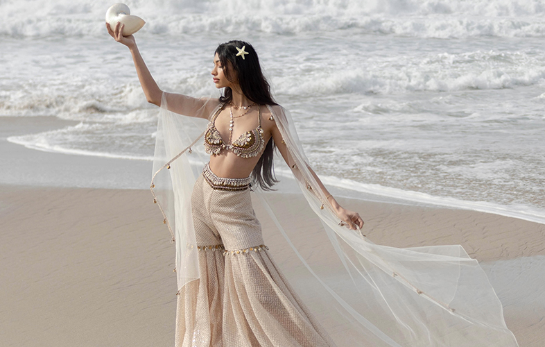 Ethnic was always royal and classy. But here is a sharara set that pops and rocks. The shrug in sequins, the shell details, and the bold bustier add a hint of allure, boldness, and glamour to the sharara outfit. One can fashionably sway in a sheer sequin sharara and can still go the ethnic route. How did you like the unexpected ‘match made in heaven’?