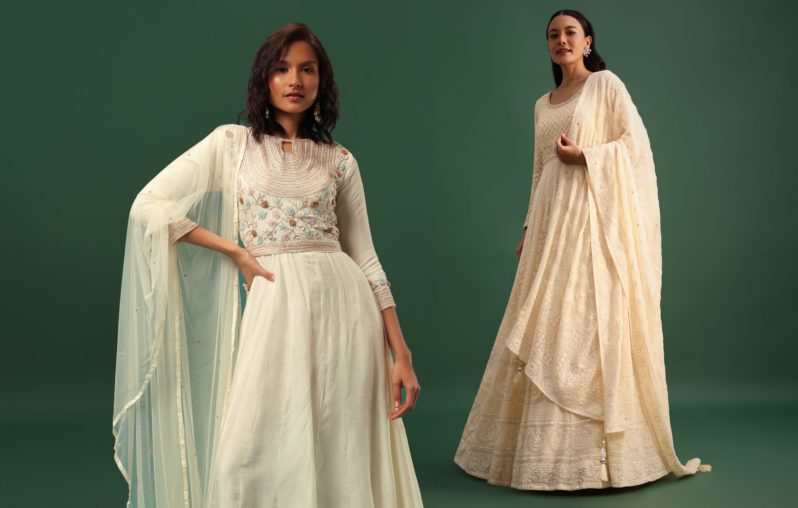 In earlier times, the Anarkali’s were characterized by rich mirror work, Lucknowi work, intricate zari, and luxurious fabrics. This opulent Anarkali suit in an off-white hue exudes elegance and sophistication and looks legendary. The graceful outfit adorned with rich threadwork is an ideal choice for grand weddings and celebrations.