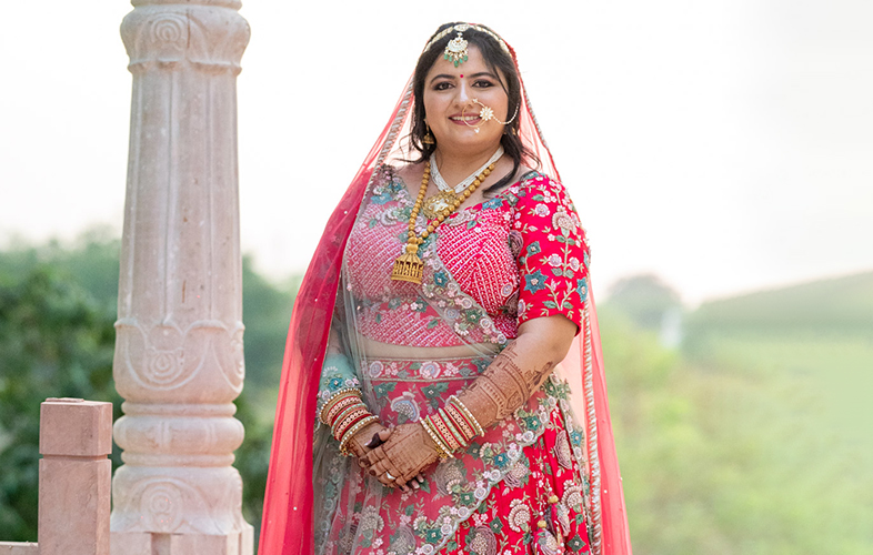 The soft make-up and the mix and match of temple jewellery long necklace along with a pearl short necklace, maang tikka, a nose ring, and a matha patti elevated the look. All thanks to KALKI, on my wedding day my husband, my parents, and my siblings were taken aback by my transformation from a tomboy to a surreal princess avatar of mine in the enchanting pink lehenga choli. Honestly, deep in my heart I too couldn’t stop blowing my own trumpet and that is why I happily posed with a wide smile and arms open while the cameraman went Click! Click! Click!