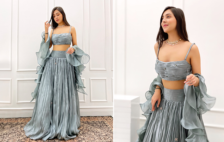 Have you been dreaming of your wedding since the age of 5? Well! Many of us already had a spectacular dream wedding much like the magnificent sets of Bhansali. Now, as you release that your age-old dream is finally turning into a reality, the first thought that tickles you is your ‘Wedding reception look’. Kalkifashion is known for turning dreams into reality. Check out this oyster lehenga with organza cape top that comes with cut dana and mirror work embroidery all over in a Moroccan jaal.