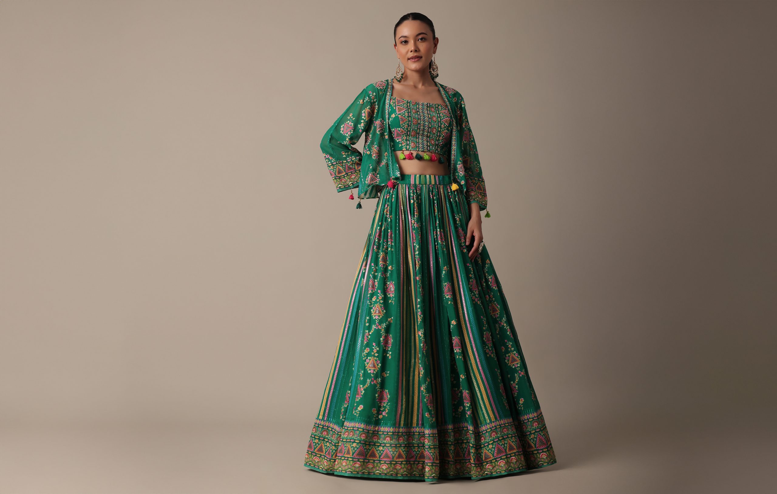 KALKI presents a plethora of green outfits for eco-conscious choices for Navratri Day 2. A green cocktail dress, light green lehenga dress, green saree, green salwar kameez in Indo-Western patterns, and other green Navratri outfits at KALKI can add a touch of tradition and grandeur to your celebrations. Ethnic and ethical fashion practices can be the best approach for Navratri this season.