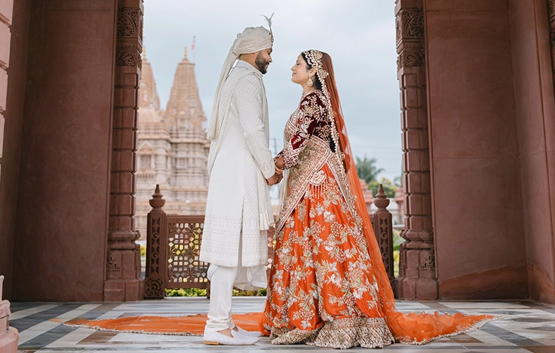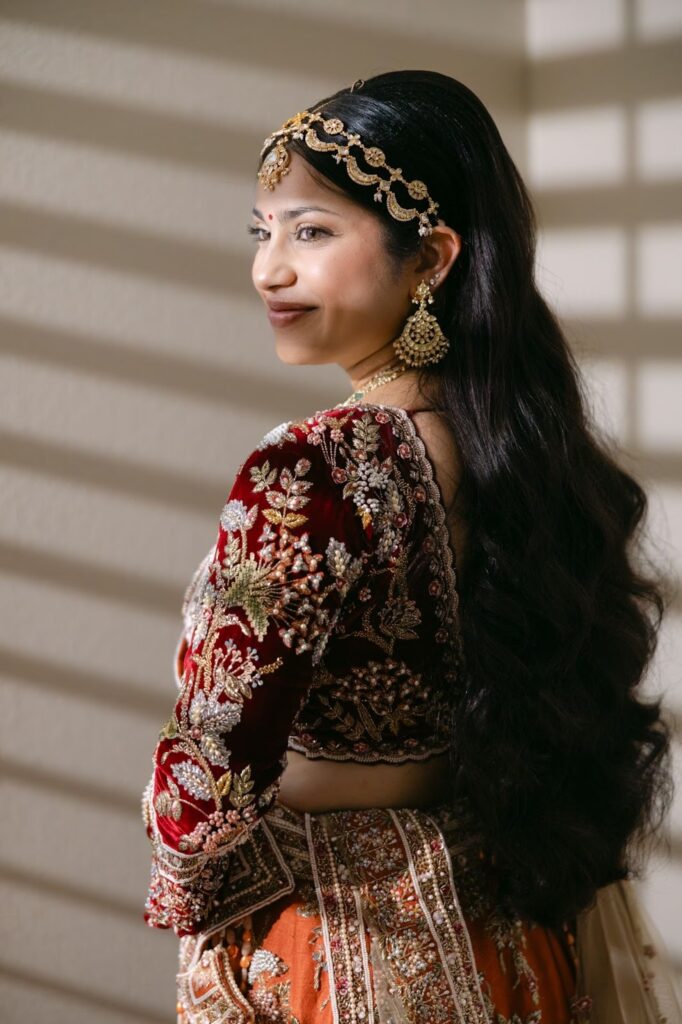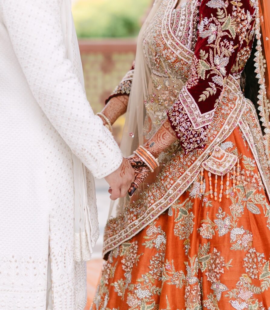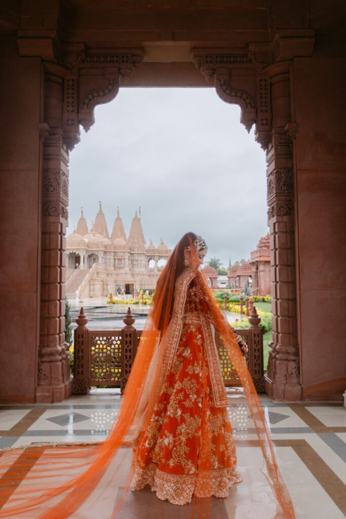 While red has long been the traditional choice for Indian brides, many modern brides are embracing alternative shades that still carry cultural significance. For Rhea, the choice of a vibrant orange lehenga felt both meaningful and refreshing.