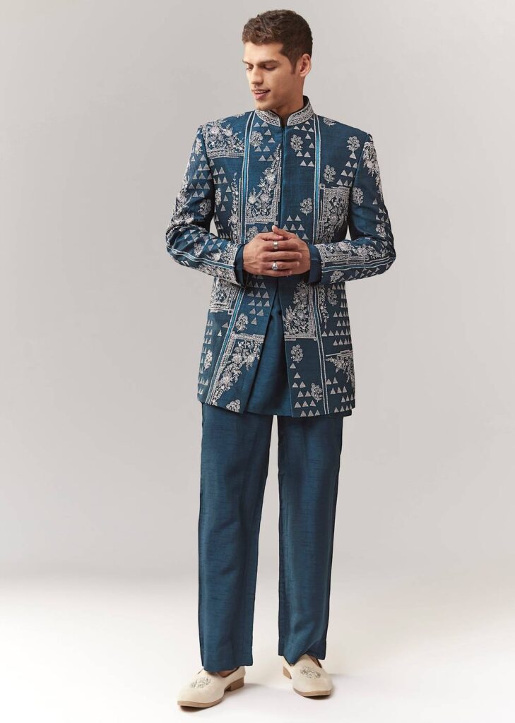 Wish to look as fashionable and trendy as your bride, embracing a contemporary designer bridal lehenga? Opt for an Indo-western groom outfit that will make you look chic. Go for new trends like unique colours, ombre effects, quirky accessories, asymmetrical cuts, etc., keeping in mind your better half’s wedding lehenga.
