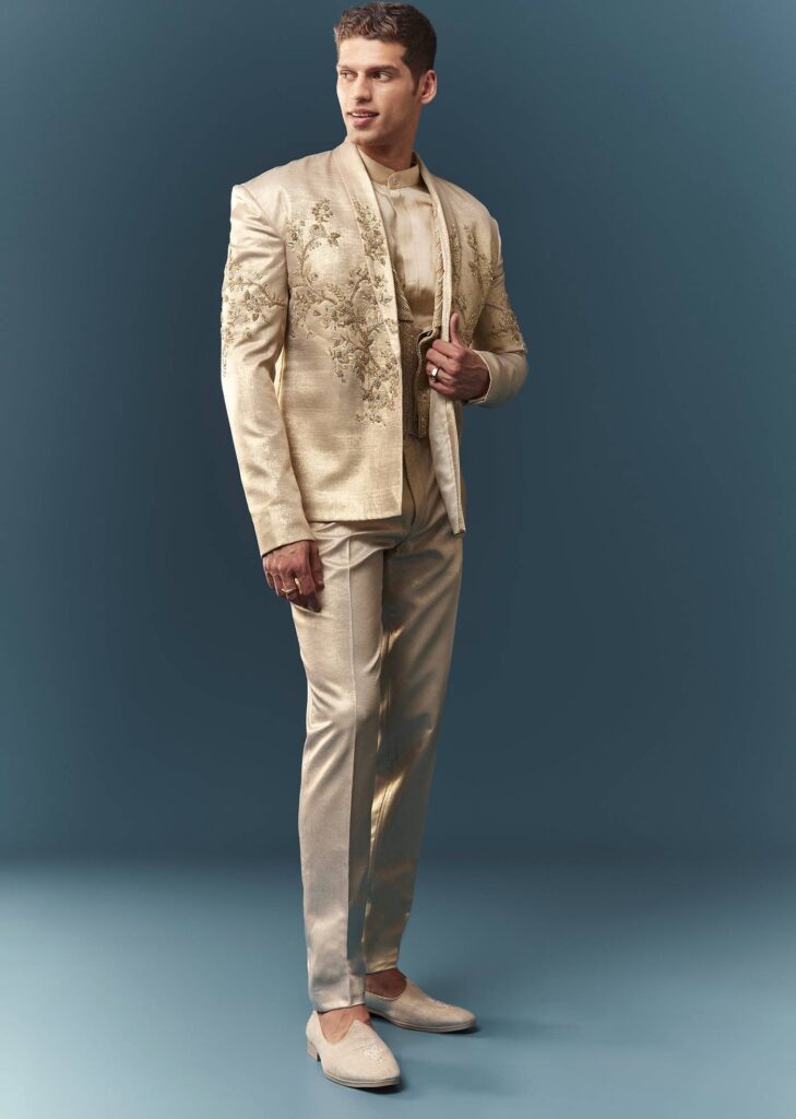 Groom’s outfits in gold, beige, or ivory pair perfectly with a red or maroon bridal lehenga. If your bride has opted for a delicate pastel lehenga, go for an Indo western set or a tuxedo in a dark hue to look polished and dapper.
