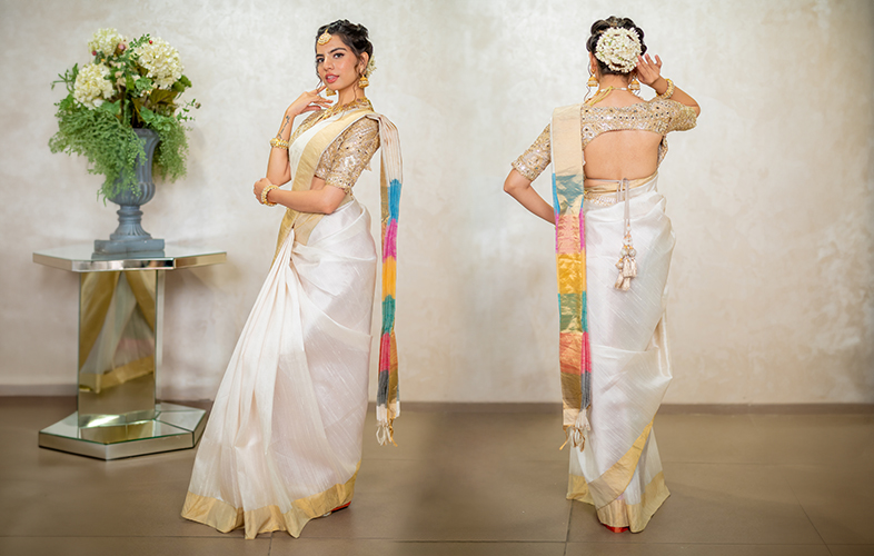Use a traditional white and gold Kerala saree for the perfect Kerala style draping. Keep your accessories, safety pins, jewellery, matching petticoat, blouse, and hair ornaments ready before you begin your drape. Footwear by your side is a great help to achieve perfection.