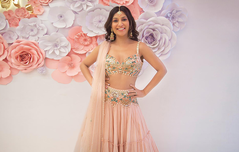 When Malini Agarwal chooses to twirl in a powder pink lehenga, we sit back and follow. The embroidered bustier goes perfectly with the peachy flowy lehenga. Throw matching polki earrings into the mix, and you have a sure-shot way of making a statement. The drape-worthy full-on glamor lehenga designs deserve a place in your scintillating festive wardrobe.