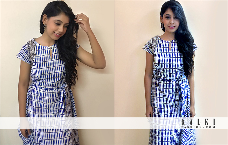 The blue and white printed top style kurta in cotton with an embellished armhole worn by the youth icon Niti Taylor, is the perfect casual outfit for those who love to wear easy breezy styles in summers. The best thing is that the length of the kurta,  you can also wear it like a dress with a pair of white sneakers on and cool pair of shades for the summer chill look.