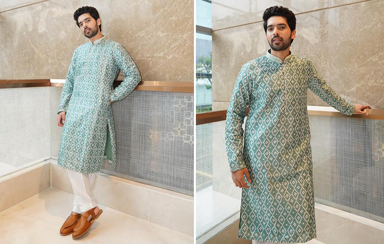 This jade green kurta sported by singer Armaan Malik at Bengaluru’s Ganesh Utsav, Day 2 brings with it an irresistible urge to dress up in a proper and perfect traditional attire. The simple kurta in bright green colour paired with white pyjamas is changing the whole game for the singer at his concert. Usually, men don’t get a lot to experiment with, but with the printed suave ethnic kurta by your side, you can easily look superbly comfortable and extremely fashionable. Grooms-to-be can easily break stereotypes by opting for such a smart, classic, and Indian festive dress set.