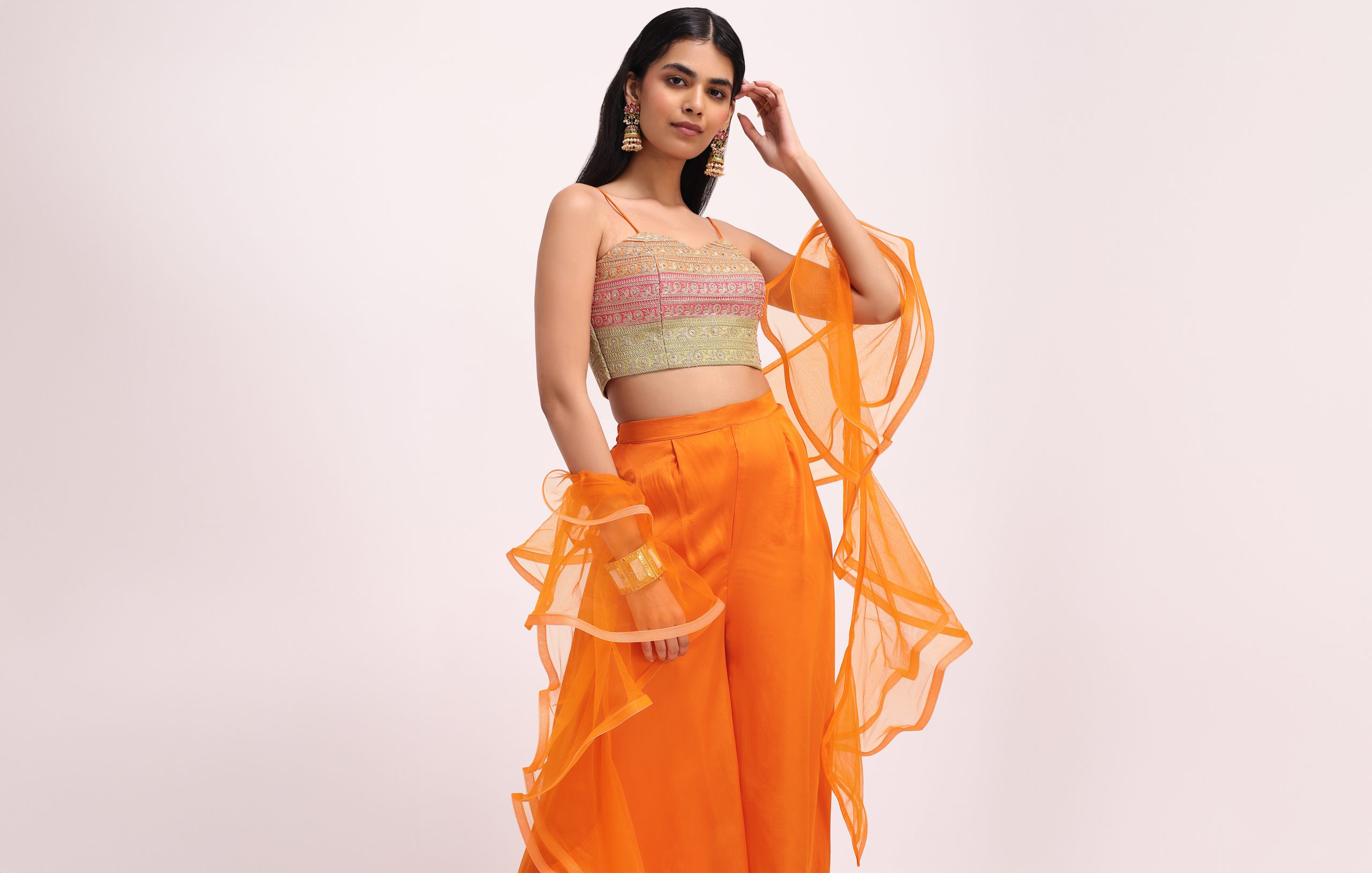 Dance your heart out and celebrate the divinity of Goddess Durga with friends and family while looking resplendent in a stylish crop top and palazzo set. It is a perfect Navratri wear for women who wish to stick to their traditions while making a striking impression. Opt for lightweight fabrics like chanderi, georgette, or chinon to enjoy the nine-night festival with ease and fervor.