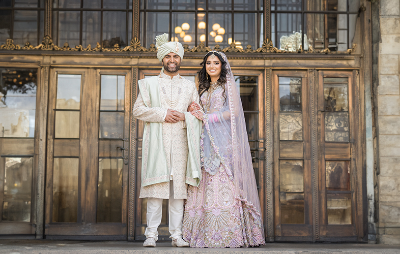 My stunning bridal outfit was a masterpiece capable of creating a stir among everyone. The pink raw silk Indian bridal lehenga looked scintillating with sequins, stones, moti, cut dana, and beads in multi-colour resham and zardozi work in 3D floral motifs embroidery. The Mughal-inspired pattern, the cutwork, and the bead fringes made the embroidered lehenga very attractive. The lilac blue net dupatta with scalloping at the border paired with a pastel pink lehenga elevated the outfit. I opted for unique bridal jewellery which consisted of a maang tikka, a necklace set, a long necklace, and a delicate hathphool. The pink chooda matched the pastel hues of the lehenga and the dewy makeup along with soft curls made me look ethereal. My better half looked dashing in an off-white sherwani paired with a sea green dupatta and turban along with a kalgi and a statement-making multilayered pearl necklace. Love was in the air and the chemistry of the science lovers was sizzling.