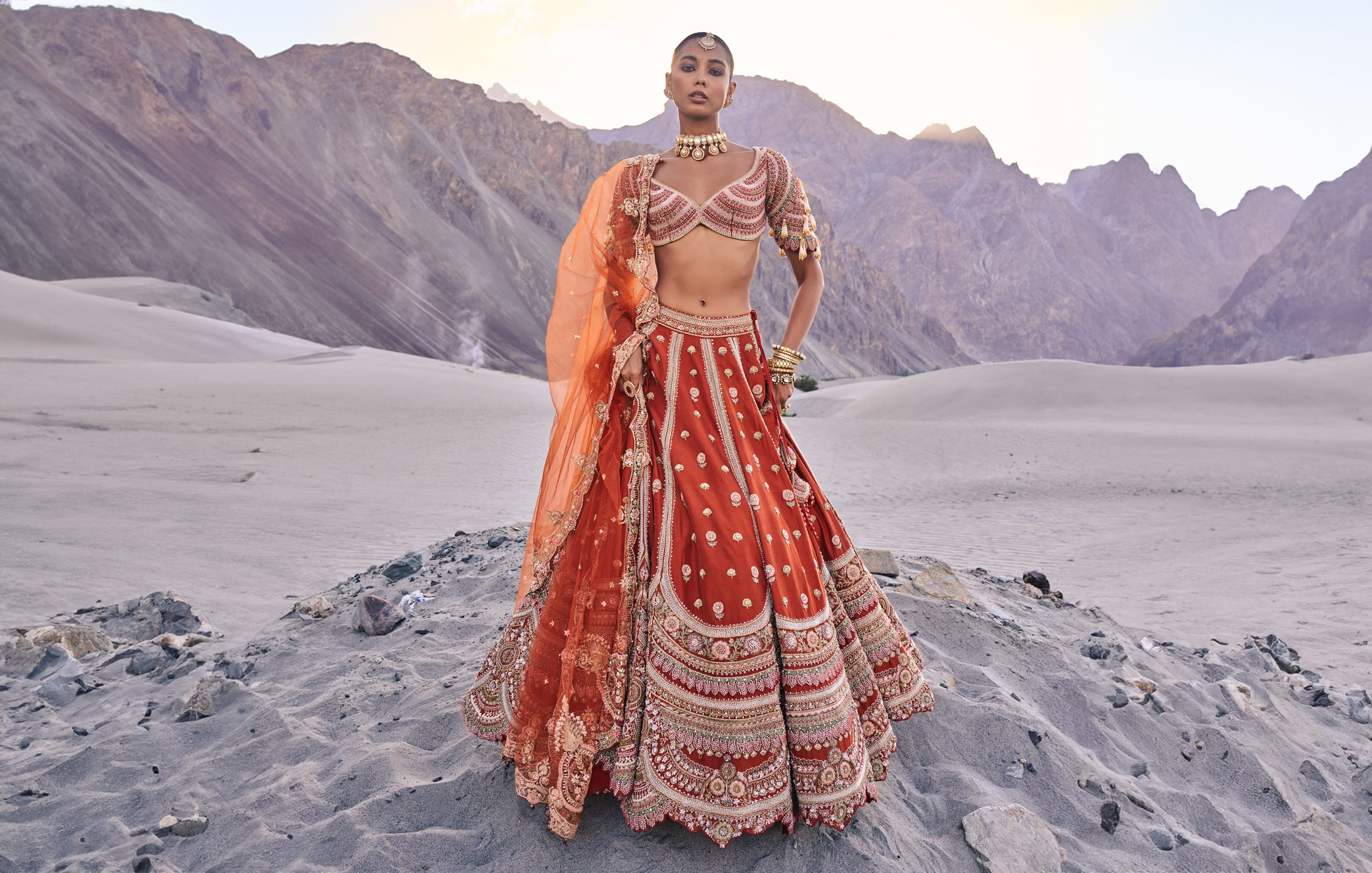Here comes one of the most entertaining variations in lehenga design – the two dupattas. The design is not only a breath of fresh air but an outstanding option for brides for the wedding event. While one dupatta can be draped stylishly around the neck, the other can be worn over the shoulder, thus, achieving an offbeat, layered look. The warm sun-kissed shade of rust orange with rich embroidery at the hem gives this fusion lehenga choli a vintage touch and lifts the richness and grandeur.
