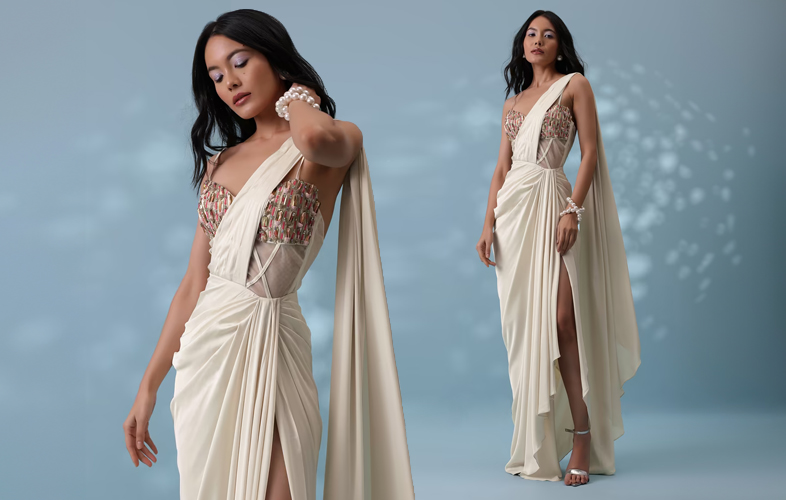This ready-to-wear saree can be the flag bearer of fusion vibes. By adopting a modern take on the saree; KALKI adds a twist and sets the goal right for cocktails, pre-wedding ceremonies and reception wear. The saree dress also sets the signature style for women who wish to carry femininity, boldness, and tradition altogether. The pre-drape embroidered saree gives modern Indian women a chance to carry tradition in an Indo-western way.