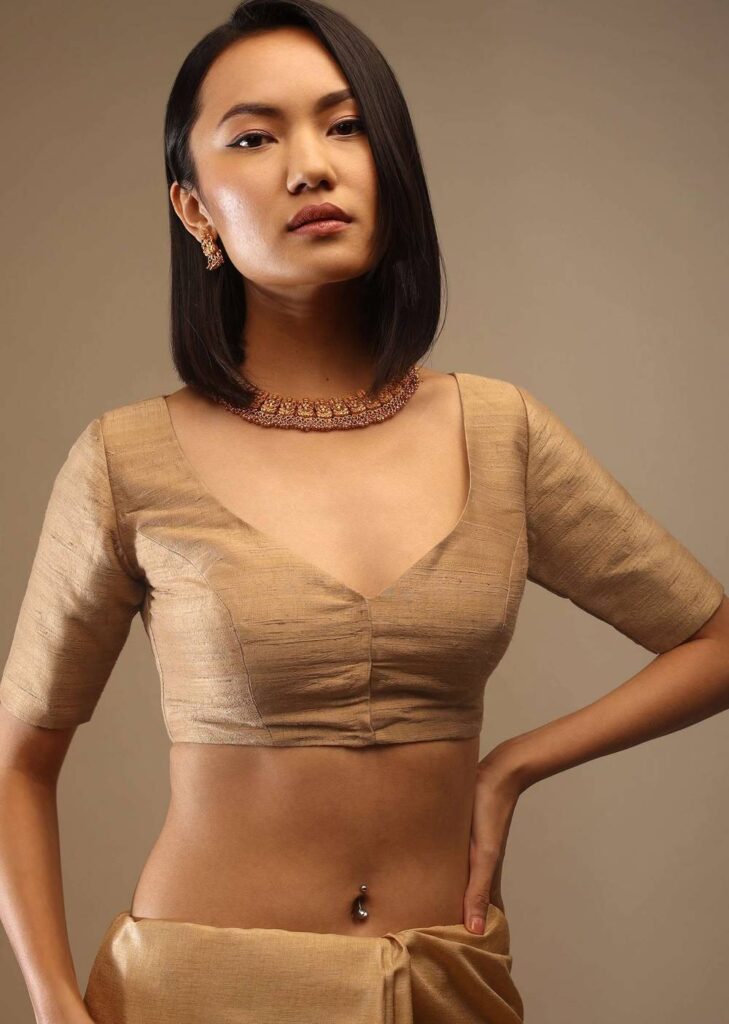 Classic styles that feature boat necks, long sleeves, high necklines, or round necks suit silk sarees the best.