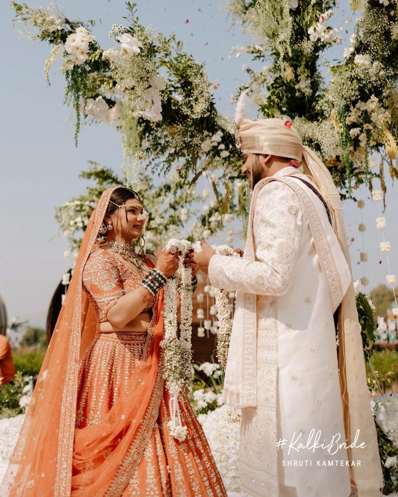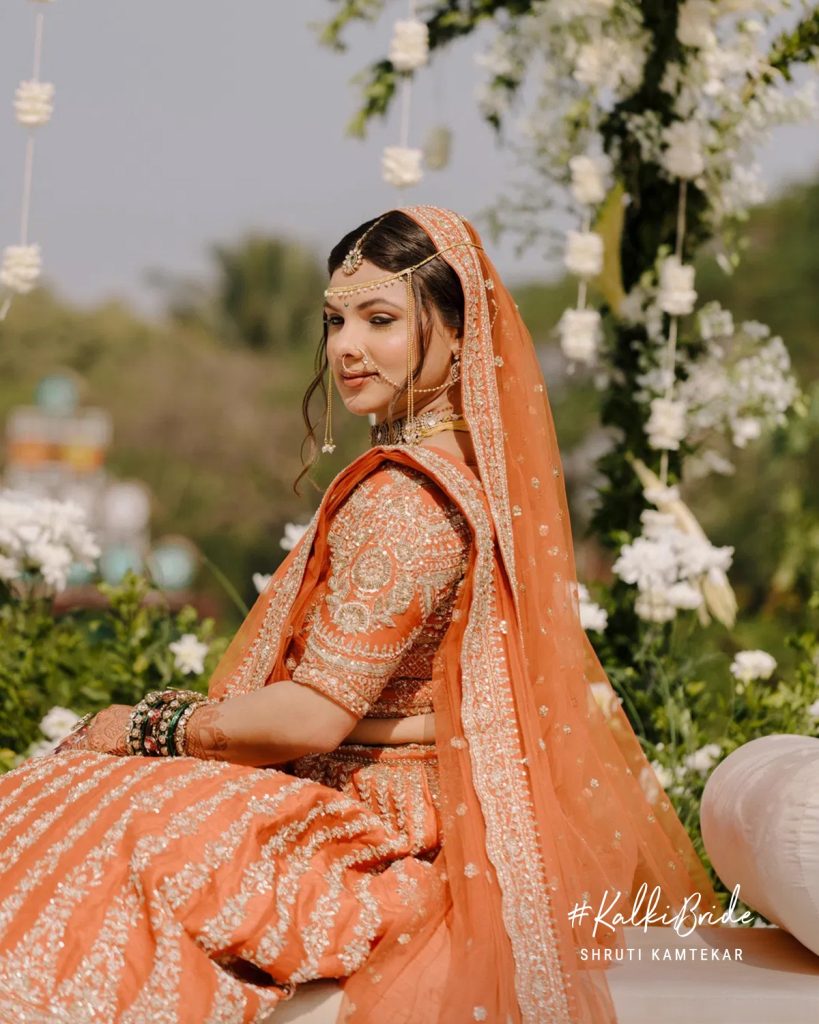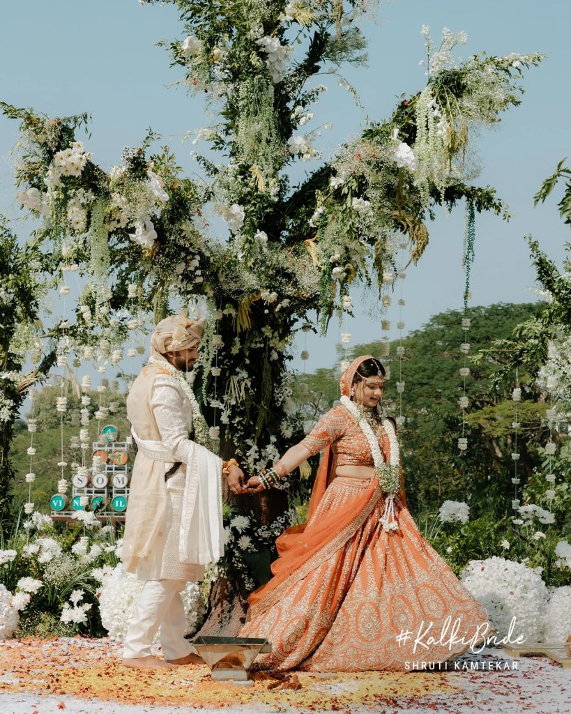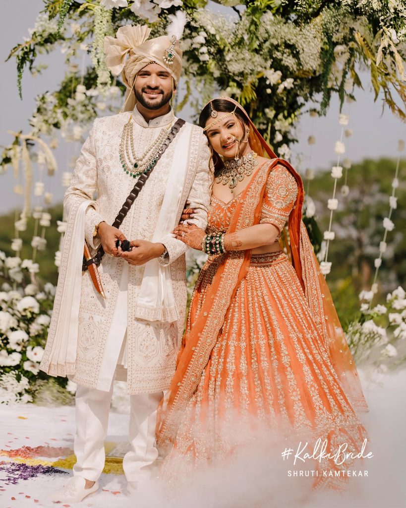 Shruti’s bridal look was nothing short of unforgettable. Dressed in a rust-orange Kalki lehenga, she redefined what it means to be a modern Indian bride, rooted in tradition yet effortlessly distinct.