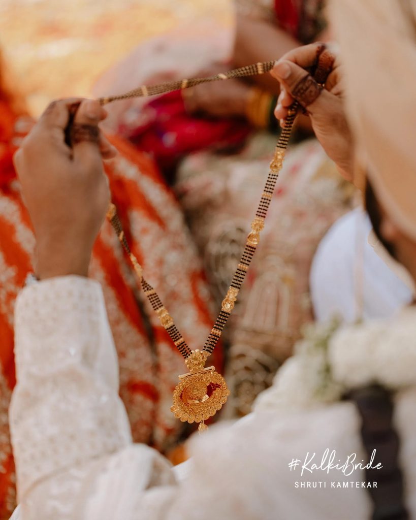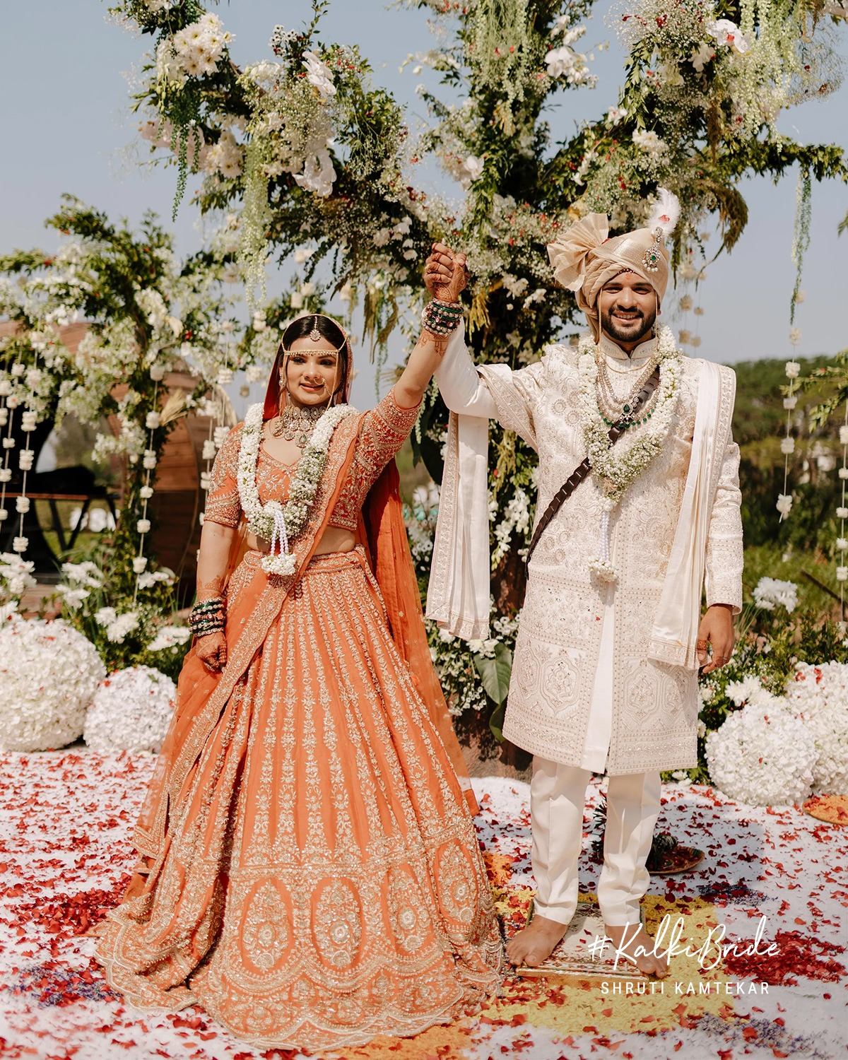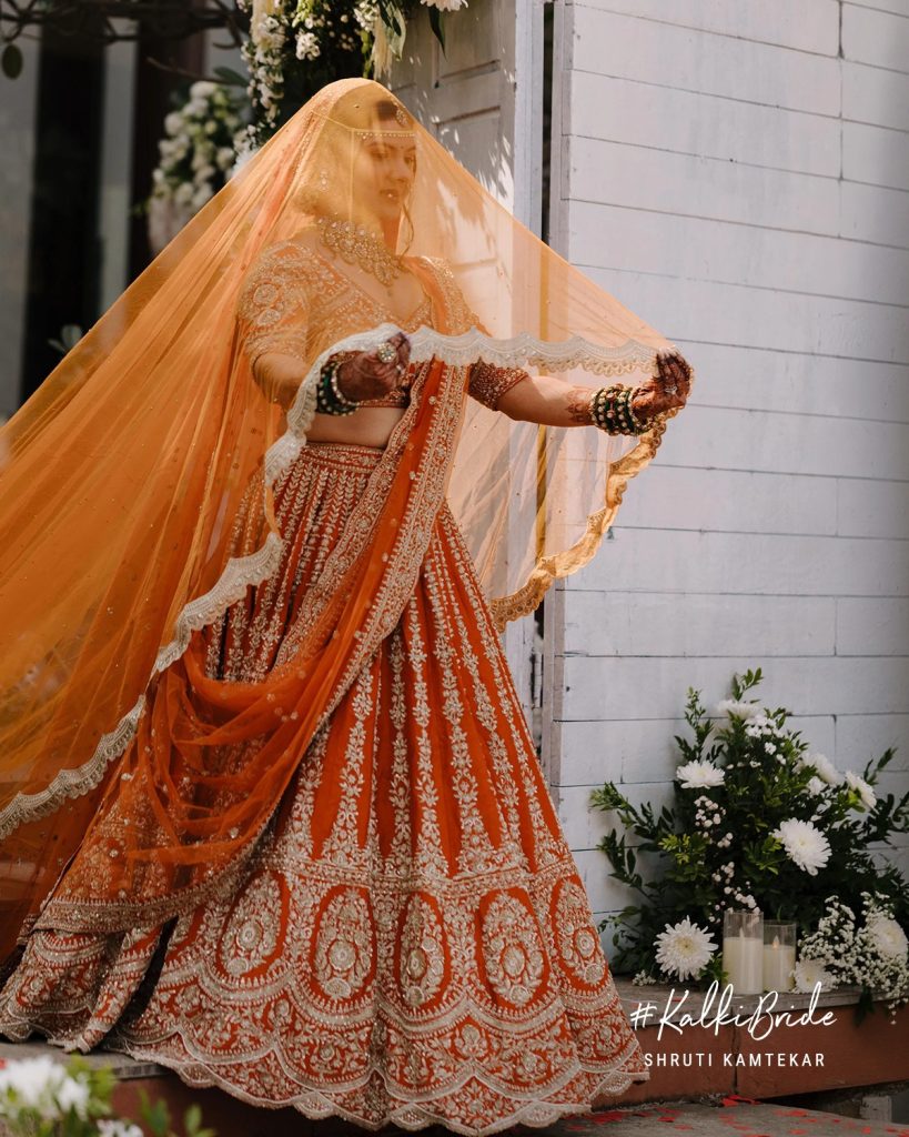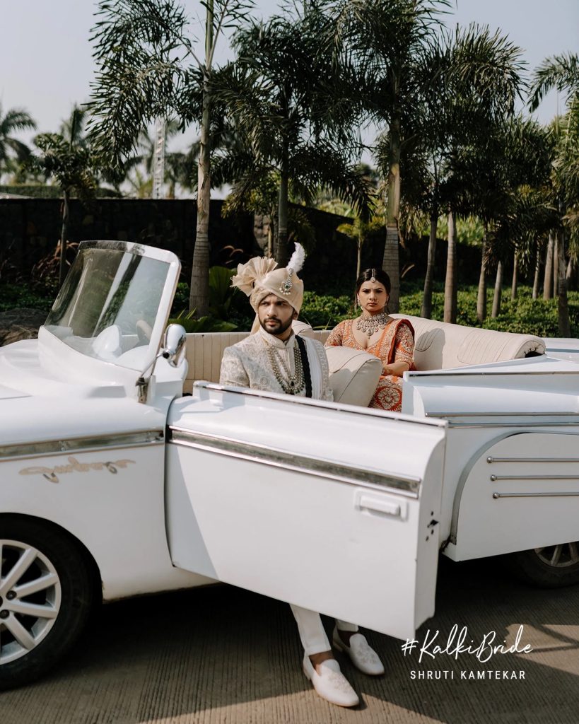 Shruti’s bridal look was nothing short of unforgettable. Dressed in a rust-orange Kalki lehenga, she redefined what it means to be a modern Indian bride, rooted in tradition yet effortlessly distinct.