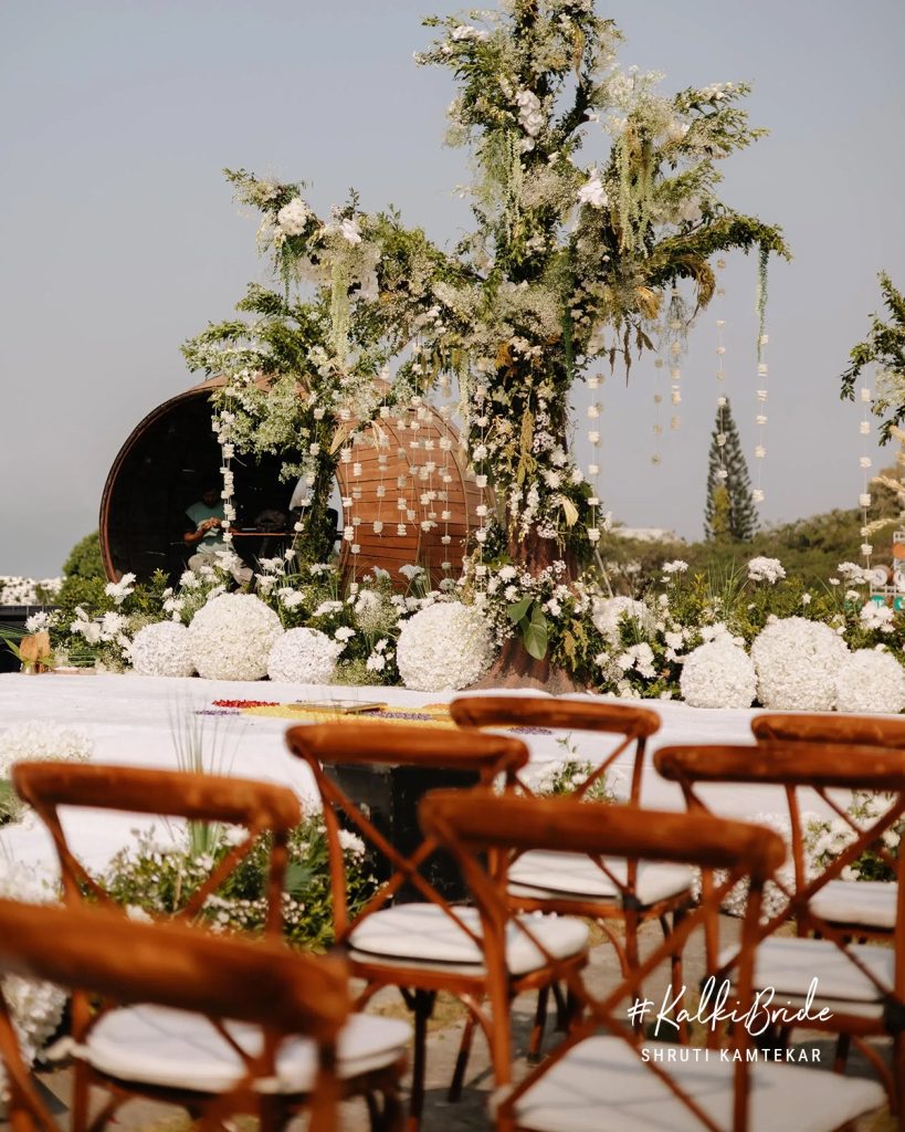 At the heart of the ceremony stood a mandap unlike any other, a living tree brought to life through cascading florals, soft whites, and organic textures. Inspired by the Banyan Tree, known in Indian culture as the Akshay Vat or “Eternal Tree,” the structure symbolized longevity, strength, and an ever-growing bond. A subtle yet deeply personal nod, the symbolism felt almost poetic, Akshay, the groom, sharing his name with the tree that represented their union.