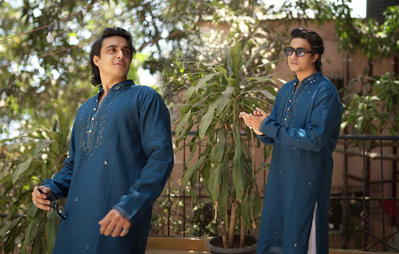 Trendy groomsmen, brides-men and the grooms themselves can opt for this Prussian blue kurta set that is curating a look-book for the dashing men out there. Without further ado, we dig into this latest ethnic outfit idea and styling option offered to us by the young influencer. He has paired a resham and mirror-work blue kurta with a simple pyjama. Crafted in front button closure, embroidery and full-sleeves, the kurta is looking timeless and appropriate. Tanzeel’s appearance in a simple embroidered kurta looks impressive as it’s a designer number to add on to his style statement. He has combined elegance and unique style in an amazing manner to look great and also feel more confident. Isn’t he making the festive shopping spree easier for you guys?