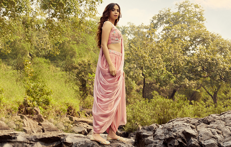 While choosing the best outfit for your friend’s wedding, the colour often becomes the deciding factor. Fret not, as you can try this ethnic yet trendy outfit in a lovely pastel hue. You can drop your apprehensions of a light and dull hue with this stylish and appealing crop top suit with multicoloured beads embroidery on it. The detachable drape and the dhoti make the outfit all the more funky and edgy. Isn’t the outfit minimal and divine at the same time?