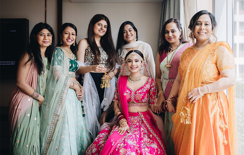 Colourful, soulful, and vivid; that’s how the bride Jasmine’s lehenga from KALKI appears to the onlookers. We never thought that the colour as common as pink would become a trend worth bookmarking. Jasmine has truly wowed us with her unique wedding lehenga choice and favourite fashion colour- pink. The cut-out design of the choli is also giving major inspo on how to stand out at your wedding with a unique pattern. Resham, zardozi, cut-dana, sequins and salli fringes on the border of the matching net dupatta are definitely leaving an impression.