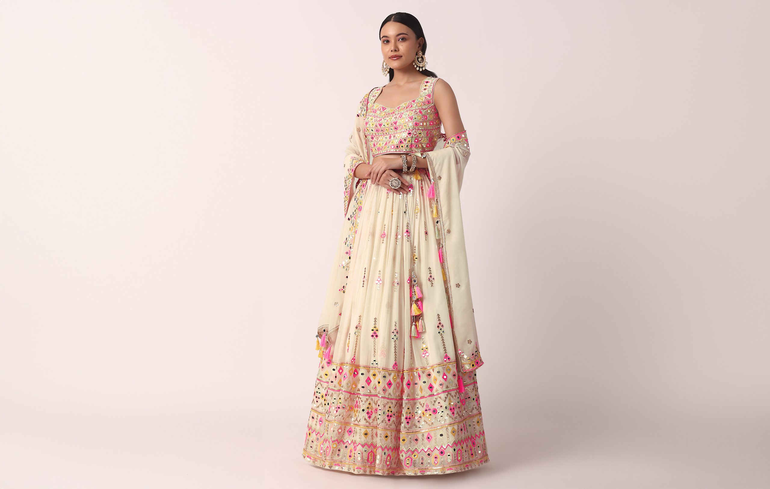 As the air is filled with fun, joy, and enthusiasm for Navratri, KALKI brings you the millennial-friendly festive colour for your lehengas, suits, Anarkali’s, dresses, and Indo-Westerns. There is a spike in the number of fashionistas who would love to opt for the colour white for the Dandiya night, Navratri puja or to honour the divine energy. Here is the curated list of the best festive outfits from KALKI in the dreamy and classy white that would help you break free from traditional colours.