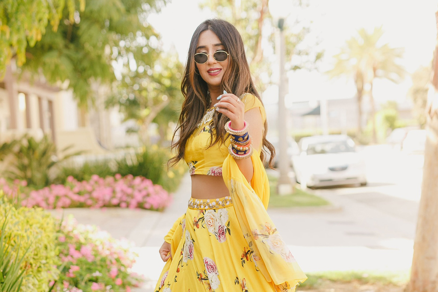 Considering the heat and humidity during the summer months, our outfits need to be lightweight, soft, and flowing. Think feather-light cotton silks, chiffons, and handwoven silks in bright colours and floral prints. Still on the fence about committing to breezy prints instead of heave embellishment for the wedding celebrations? Let Nikki Sachdeva be your inspiration for choosing that one voguish and effortless summer wedding outfit. Nikki Sachdeva, a fashion enthusiast, a stylist from LOS ANGELES, California and the founder of Runway to Road is giving us major outfit goals in this stunning amber yellow lehenga with floral print.