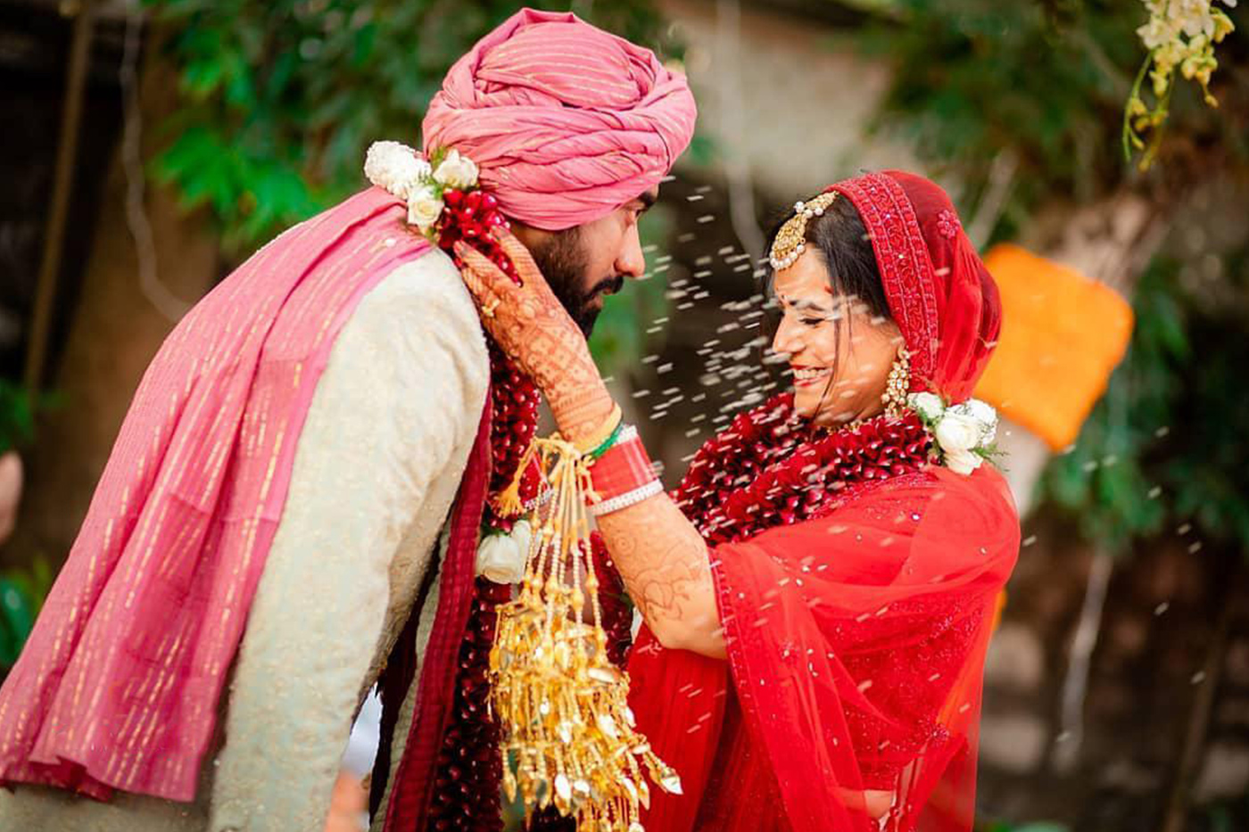 Among the beautiful pictures of the wedding, we couldn’t stop noticing her gorgeous monochrome lehenga! Mona chose a classic red trim for her wedding. She kept her look minimal and divine.