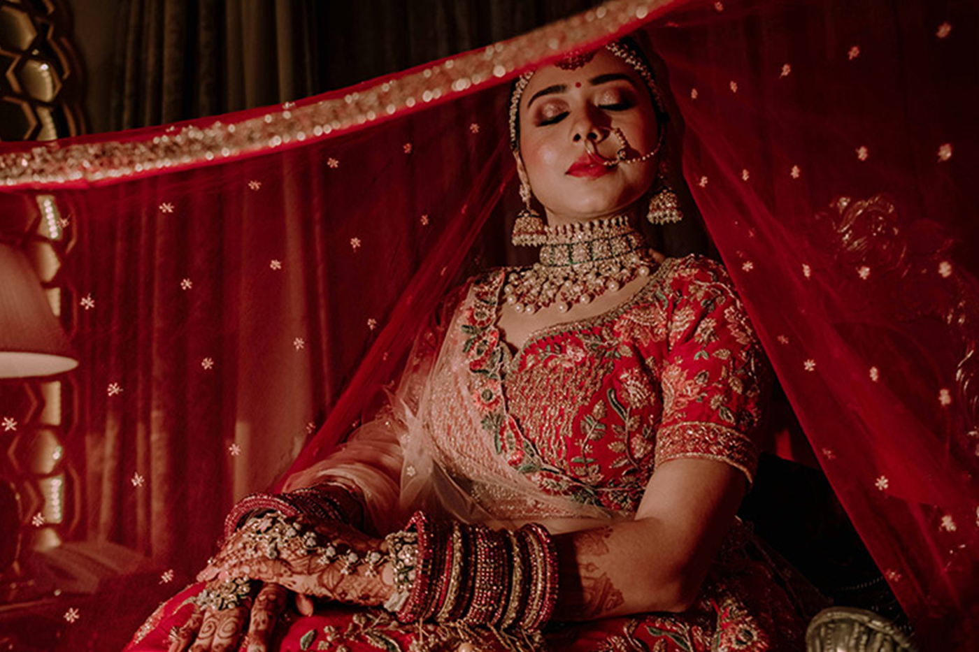 Our motive was to inculcate the detailing to give this wedding lehenga the royalty it deserves. Her scarlet presence in her flaming outfit left everyone as speechless as us! The lehenga set has fine embroidery embedded in it with an elegant net dupatta neatly pinned to her head giving her all the queen-like feels.