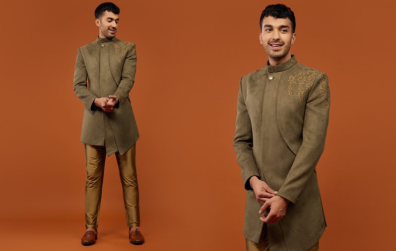 Groomsmen fashion scene in Indian weddings have been setting millennial standards continuously. Few experimental outfits with elements like flare, kalis, shrugs and floral prints have seen a boom to suddenly become a raging trend for groomsmen style rulebooks. Just like bridesmaids, groomsmen don’t hold themselves back from stepping into a different and offbeat fashion realm. If you too want to go all out with your outfit choice, this embroidered Indo-western kurta set in suede velvet is just the right pick for attending a wedding reception. The ensemble looks like the breath of fresh air for fashion and style lovers, and we are not exaggerating.