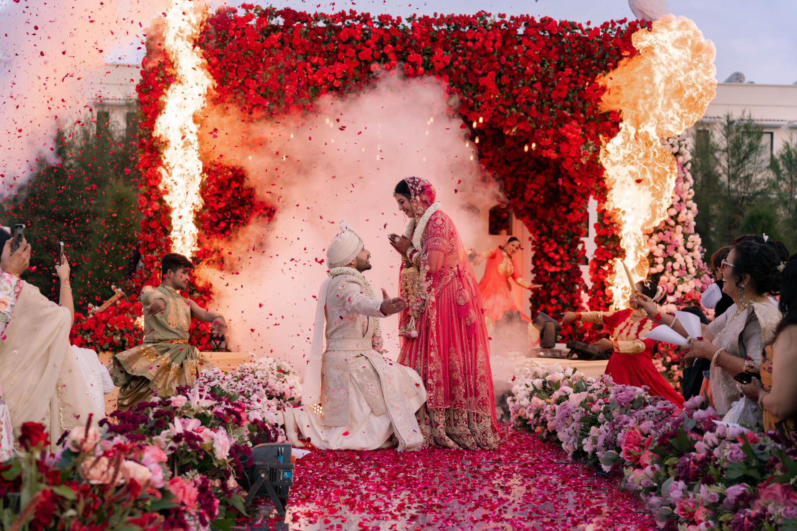Not in a loud, watch-me way. In that quietly captivating way that only comes from confidence and presence. Her dupatta floated behind her, her eyes fixed on her person waiting at the mandap, and everything around her—the sandstone, the florals, the music—just softened.